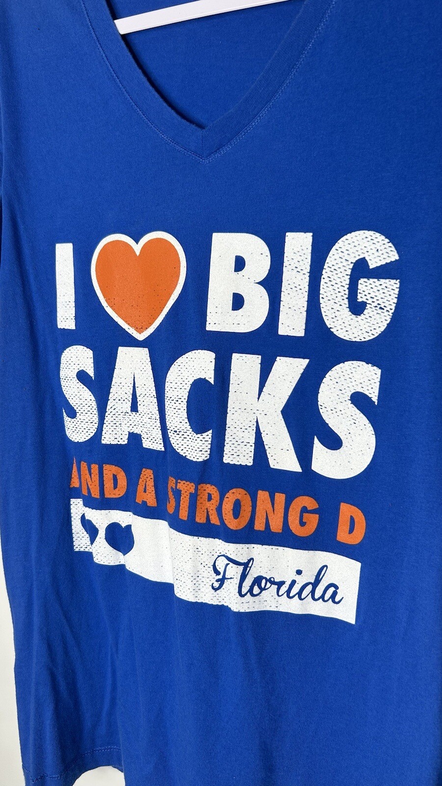 FLORIDA Football Women's Form Fitting T-Shirt SIZE XL Blue V-Neck Short Sleeve Brand: Bella Style: Form fitted football themed tee in blue with front graphic design. The shirt is form fitting so it it fits smaller and tighter than a typical XL. Please study the measurements carefully before purchasing. Material: 100% Cotton Additional Details: Machine washable Condition: Good Used Condition. Normal signs of wear and tear, on the bottom hem there is a tiny bit of the thread coming undone Please review the pictures carefully for condition, details, and measurements. We do our best to describe accurately all of our items. The Approx. Measurements Laying Flat (not doubled) : 26 1/2" Top to Bottom Length 15 1/2" Shoulder to shoulder 20" Armpit to Armpit 20" Width at Hip Feel free to ask any questions. Thank you for visiting our store!