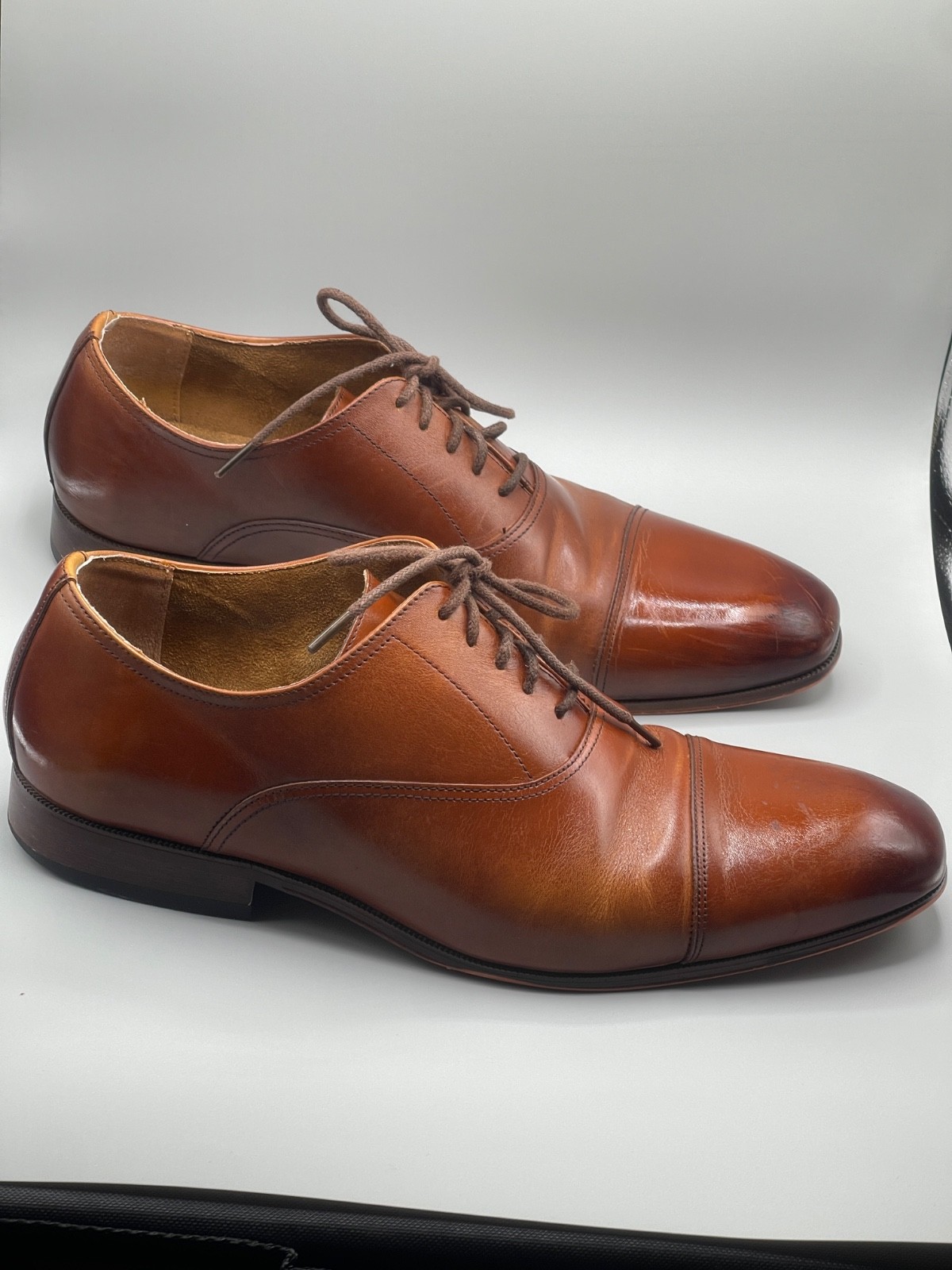 The Florsheim Cognac Leather Mens Oxford Shoe in size 9.5 WIDE is a stylish and high-quality dress shoe designed for men. Made from leather with a classic lace-up closure, this shoe features a timeless Oxford style in a sophisticated brown color. The wide width ensures comfort and room for a more casual or athletic look while still maintaining a polished and refined appearance. Perfect for formal occasions or professional settings, these shoes are a durable and fashionable choice for any man's wardrobe.