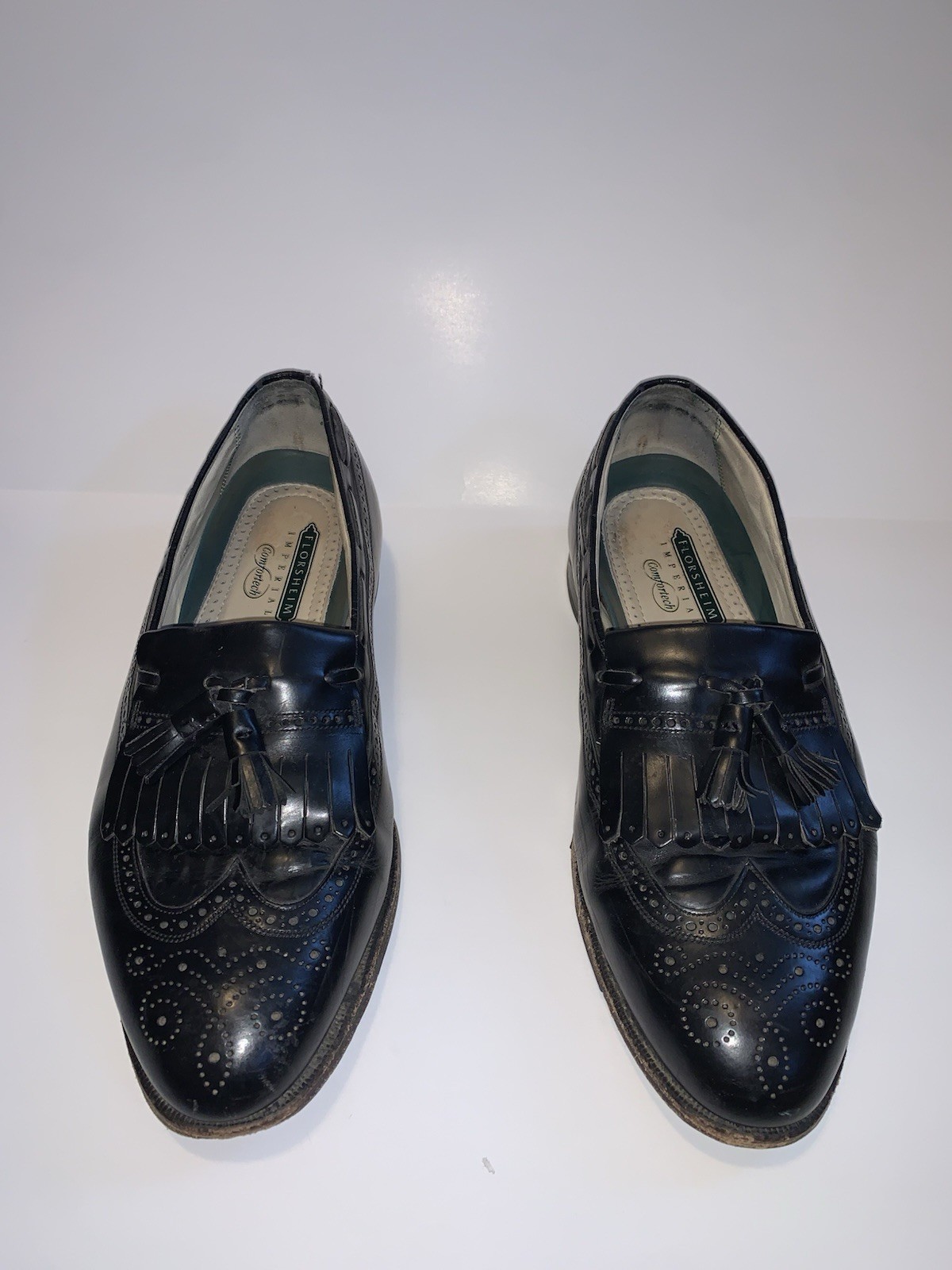 The Florsheim Imperial Comfortech Men's Tassel Loafers in size 10.5 3E are classic black wingtip leather shoes with an almond toe shape and tasseled accents. These slip-on loafers are vintage and feature a wingtip design, making them a stylish and sophisticated choice for any man's dress collection. Crafted in the USA with high-quality leather, these shoes are perfect for the summer, fall, and spring seasons, adding a touch of timeless elegance to any outfit.