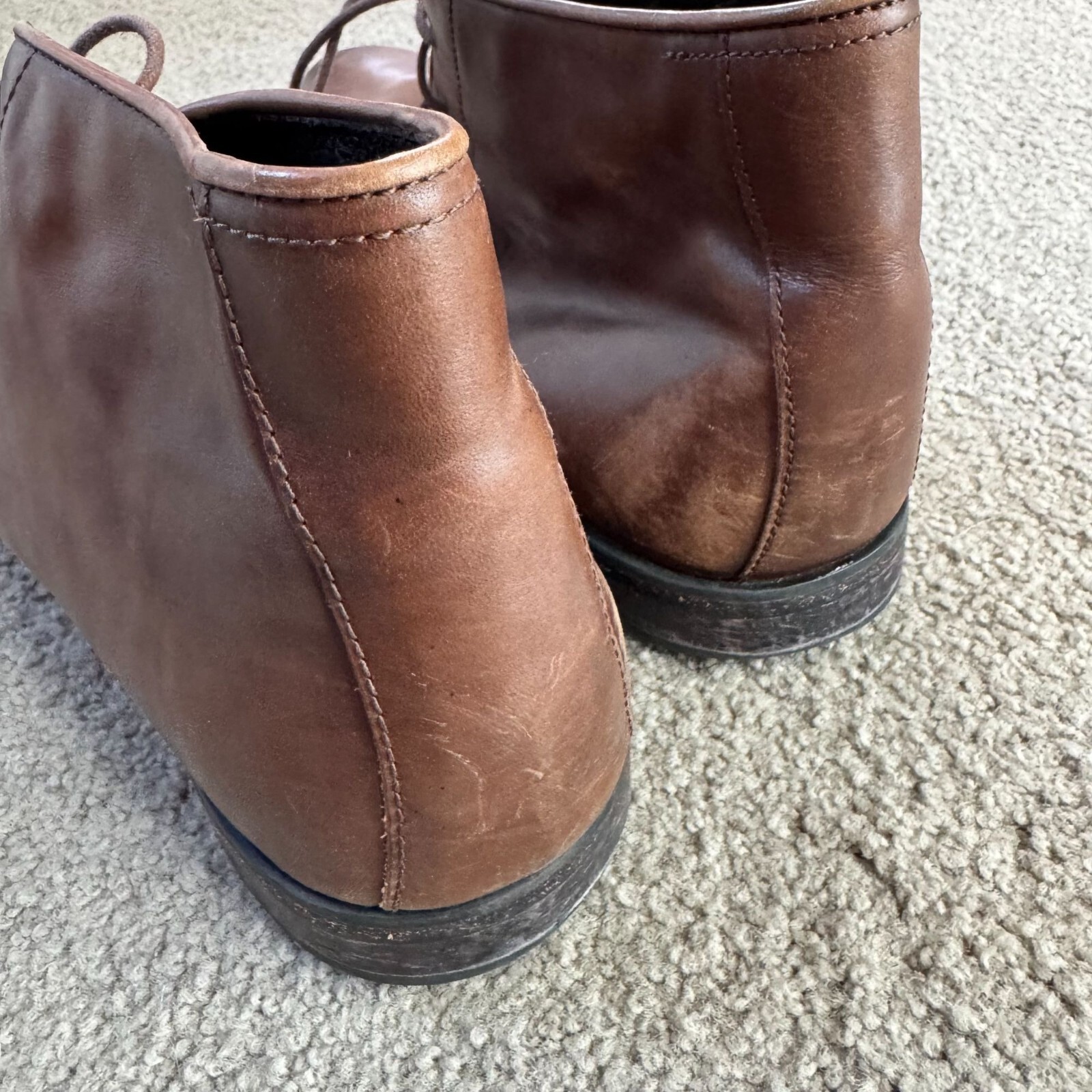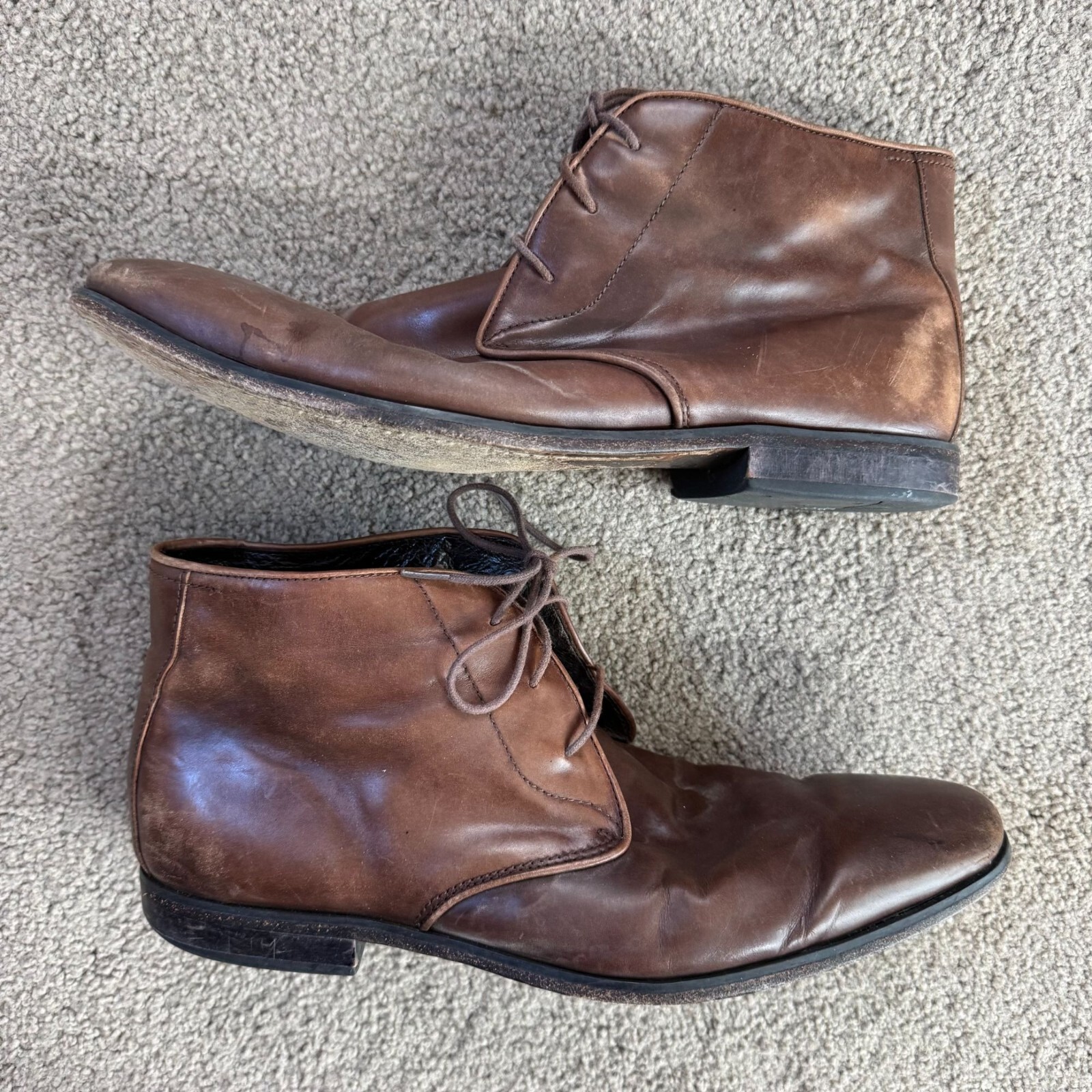 These Florsheim Chelsea boots exude a classic, timeless appeal with their rich brown hue and all-leather construction. Crafted for comfort and durability, these boots feature leather uppers, linings, and soles. The sturdy lace-up design ensures a secure fit, making them a reliable choice for both formal and casual settings. • Lace-up closure for secure fit • All-leather construction • Vintage-inspired design • Durable leather sole • Made in China Visible creases and scuffs on toe area and heels, indicating wear. Top to bottom = 5.5 inches.