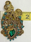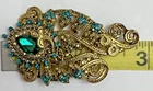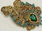 Pre-owned Aqua Blue, Green, Aurora Borealis (AB) Colors, Crystal, Glass Rhinestone, Flower, Bird, Peacock Feather Plant Leaf Nature Brooch Pin. Beautiful Striking Colors, Detailed Vintage Metal, Paisley Design Pattern. Approximately 2 3/4 inches High or Wide depending on position worn Actual color may be slightly different and will vary from each computer monitor or electronic device. T his item has been in storage for around 10 years and is in excellent condition. i03P