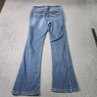 Brand: Flower Style: Womens low-rise bootcut jeans with a regular fit, ideal for casual everyday outfits. Color: Blue medium wash denim with whiskering and fading at the thighs and seat for a naturally broken-in look. Size: Womens 28 with a low-rise waist and bootcut leg opening, appropriate for pairing with boots or sneakers. Materials: Classic denim fabric with contrast stitching; exact fiber content is not specified on the visible tags in the photos. Design details: Zip fly with metal button closure, belt loops around the waistband, and traditional five-pocket styling with two front scoop pockets, a coin pocket, and two back patch pockets. Embroidery and branding: Back pockets feature decorative embroidered loop detailing that adds visual interest, and interior waistband branding shows the Flower logo. Features: Low-rise waist, regular fit through the hip and thigh, and bootcut leg designed for comfortable everyday wear with a variety of footwear. Additional info: Contemporary non-vintage style denim jeans suitable for casual, weekend, or school wear; stored in a protective bag between uses. Flaws: Pre-owned jeans with light general wear and wash fading to the denim; fabric, seams, zipper, button, and embroidered pockets are clean and intact without holes, stains, or fraying, and leg hems show only minor wear.