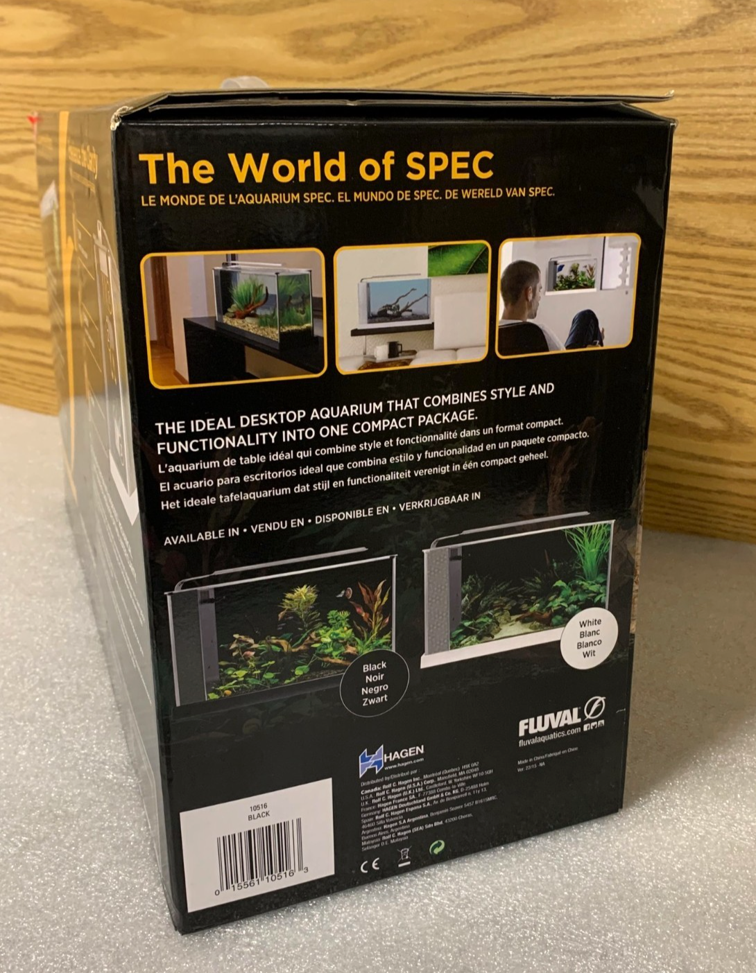 BRAND NEW Fluval -10516- Spec Aquarium Kit - Black - 5 Gallon- Desktop Glass Aquarium Fluval Spec is a contemporary-looking aquarium designed for small areas such as desktops and countertops. This 5 gallon etched-glass aquarium with aluminum trim combines style and functionality in one small package. Though small in stature, Fluval Spec is big on features. It comes with a sleekly-designed overhanging lighting system, consisting of 37 powerful LED lamps, that arches above the aquarium to provide brilliant illumination for plants and décor.