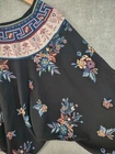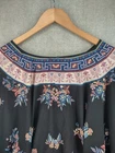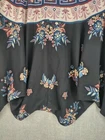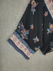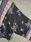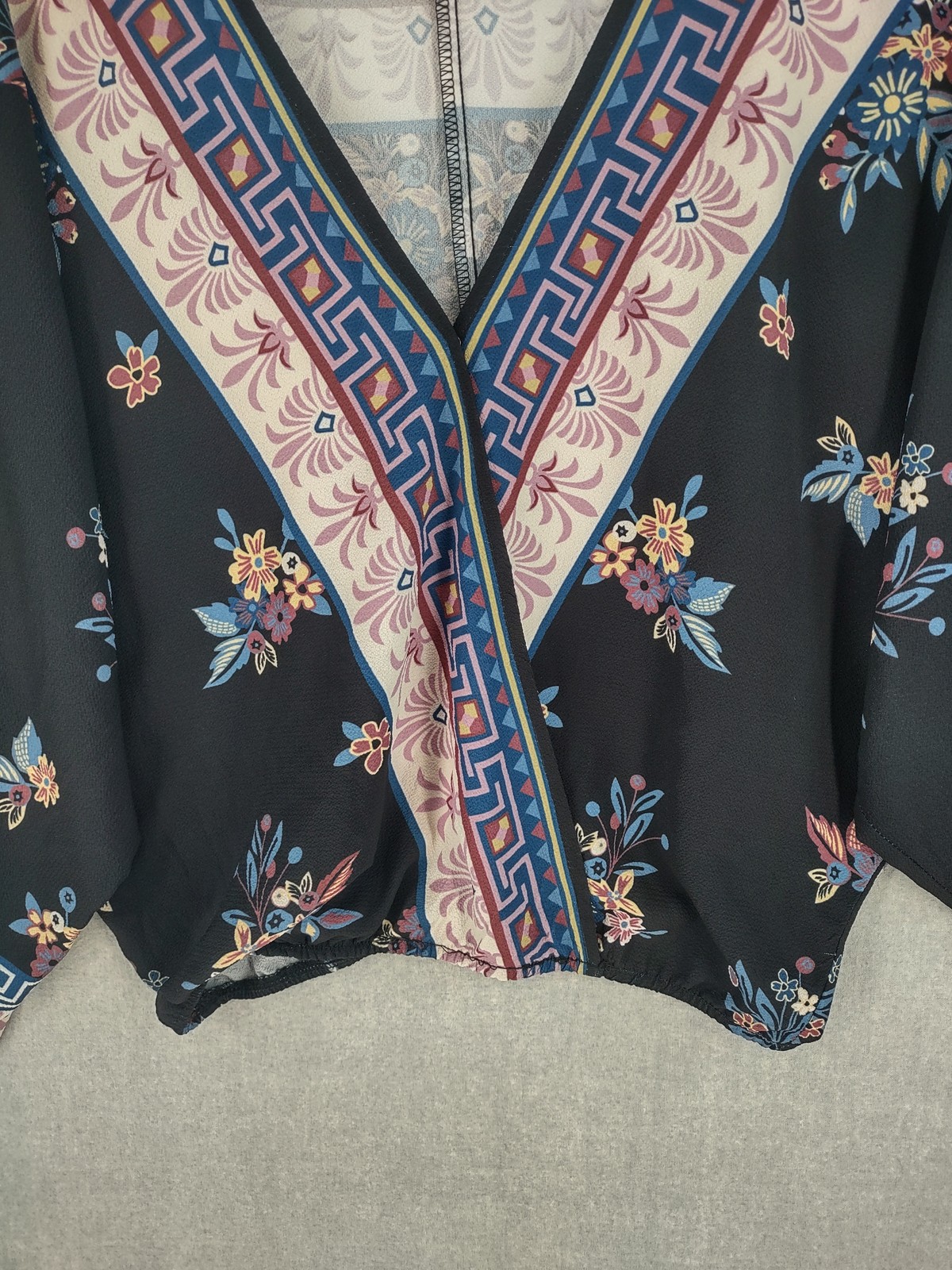 Flying Tomato Kimono Top Womens Small Black Boho Floral Blouse Wide Sleeve Crop Condition: Gently worn, no visible flaws, excellent used condition throughout Shell composition: 98% polyester, 2% spandex for a lightweight, flowy drape All-over floral and geometric border print in blue, purple, pink, and yellow tones Wide kimono sleeves with contrasting trim and loose, cropped silhouette Open front, slight V-neck shape, elastic hem for easy, relaxed fit Tag size: Small (Womens); please review measurements in photos for fit Brand: Flying Tomato (see photos for tag details) Style: 11019C-TJ Hand wash cold, lay flat to dry (per care label) 50-4092