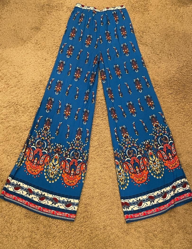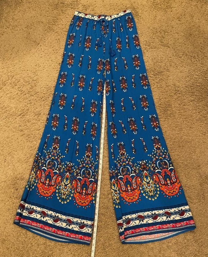 The Flying Tomato Women's Blue Multicolored Multiprint Pull-On Palazzo Pants in size Small are a stylish and comfortable addition to any wardrobe. Made from soft and stretchy rayon material, these pants feature a high-rise waist with an elastic waistband for a perfect fit. The wide-leg design and palazzo style offer a relaxed and bohemian look, while the accented tassel tie adds a trendy touch. These pants are ideal for a casual and effortless outfit, perfect for any occasion.