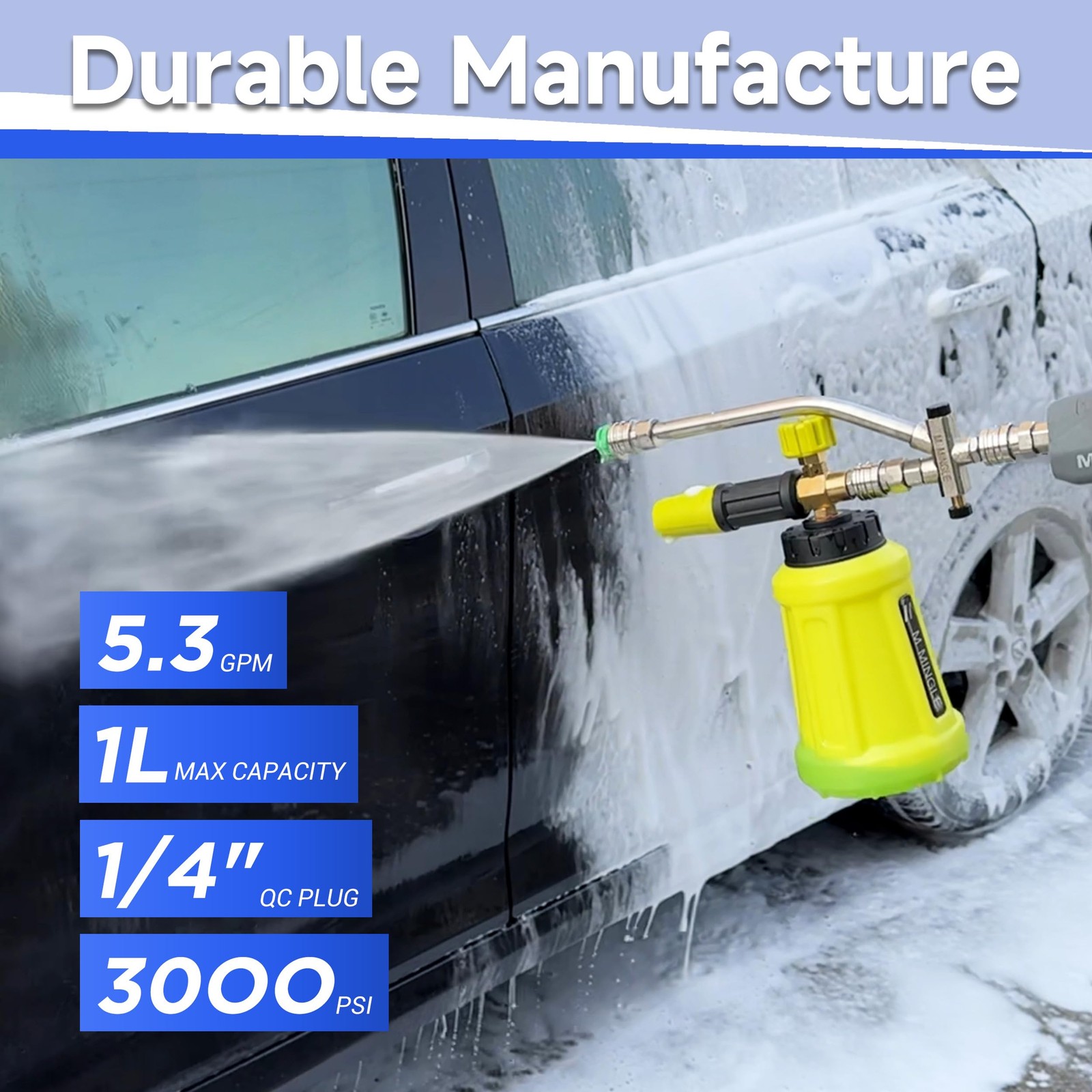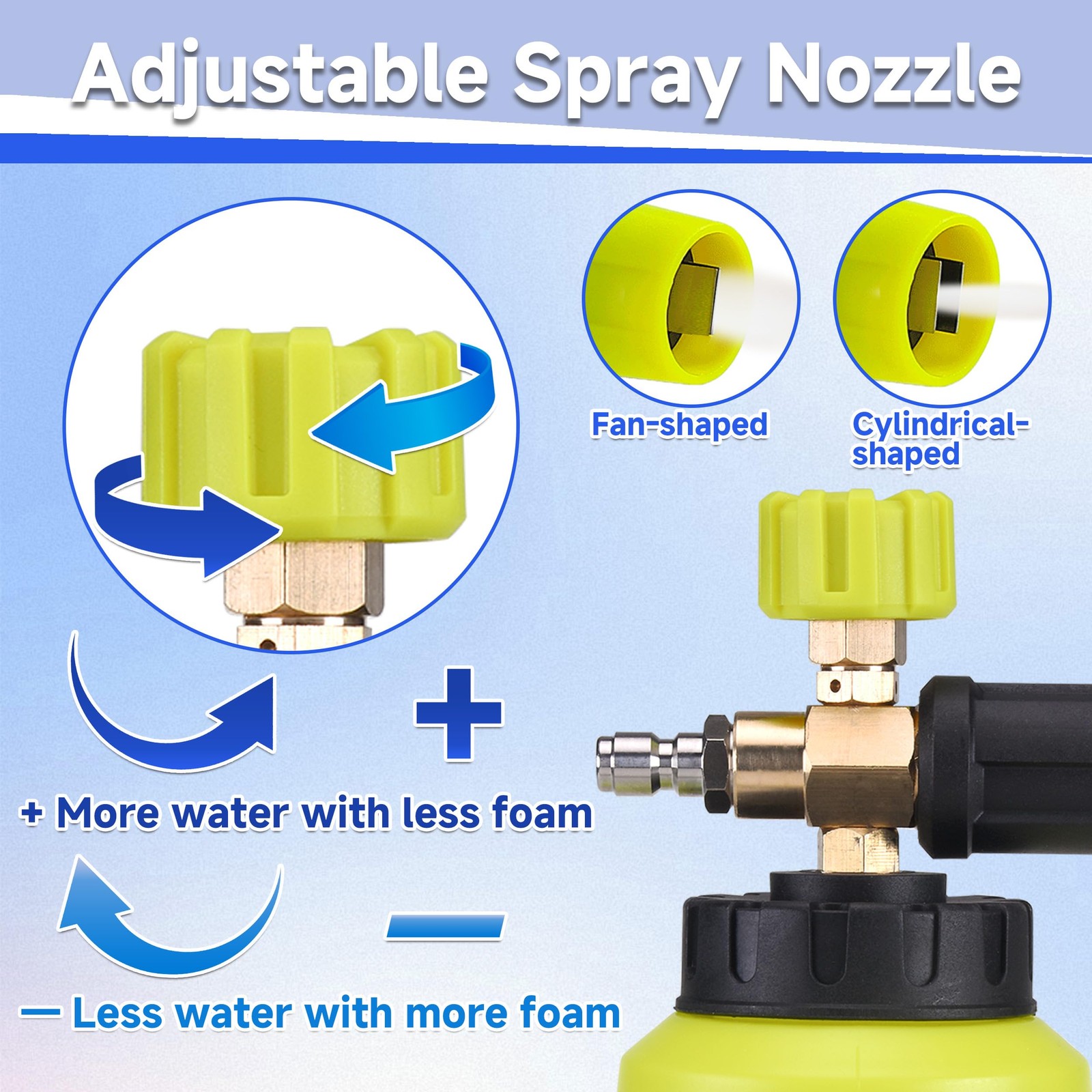Thick Power Washer Foam Cannon: 1 liter large capacity with a wide-mouth design, quickly produces thick and even foam. Adjustable nozzle for different spray modes, delivering ultimate efficiency and results for your cleaning jobs. Foam Cannon Dual-Connector Accessory: Unique dual-head connector with a two-way valve, allowing for easy switching between foam and water flow modes without the need to constantly change nozzles, saving you time and effort. Quick Foam-to-Water Switch: Easily switch between foam and water modes with the foam cannon dual connector and pressure washer foam cannon for efficient, time-saving cleaning. High-Quality Durable Materials: This snow foam is made from premium brass, stainless steel, and high-strength plastics, resistant to high temperatures and pressure, ensuring long-lasting durability and reliable performance. Professional Foam Cannon Kit: Includes foam blaster, dual connector, 5 nozzle tips. Ideal for various cleaning tasks like vehicle and floor washing, house exteriors. One kit satisfies all your cleaning requirements. Thick Power Washer Foam Cannon: 1 liter large capacity with a wide-mouth design, quickly produces thick and even foam. Adjustable nozzle for different spray modes, delivering ultimate efficiency and results for your cleaning jobs. Foam Cannon Dual-Connector Accessory: Unique dual-head connector with a two-way valve, allowing for easy switching between foam and water flow modes without the need to constantly change nozzles, saving you time and effort. Quick Foam-to-Water Switch: Easily switch between foam and water modes with the foam cannon dual connector and pressure washer foam cannon for efficient, time-saving cleaning. High-Quality Durable Materials: This snow foam is made from premium brass, stainless steel, and high-strength plastics, resistant to high temperatures and pressure, ensuring long-lasting durability and reliable performance. Professional Foam Cannon Kit: Includes foam blaster, dual connector, and 5 nozzle tips. Ideal for various cleaning tasks like vehicle and floor washing, house exteriors. One kit satisfies all your cleaning requirements.