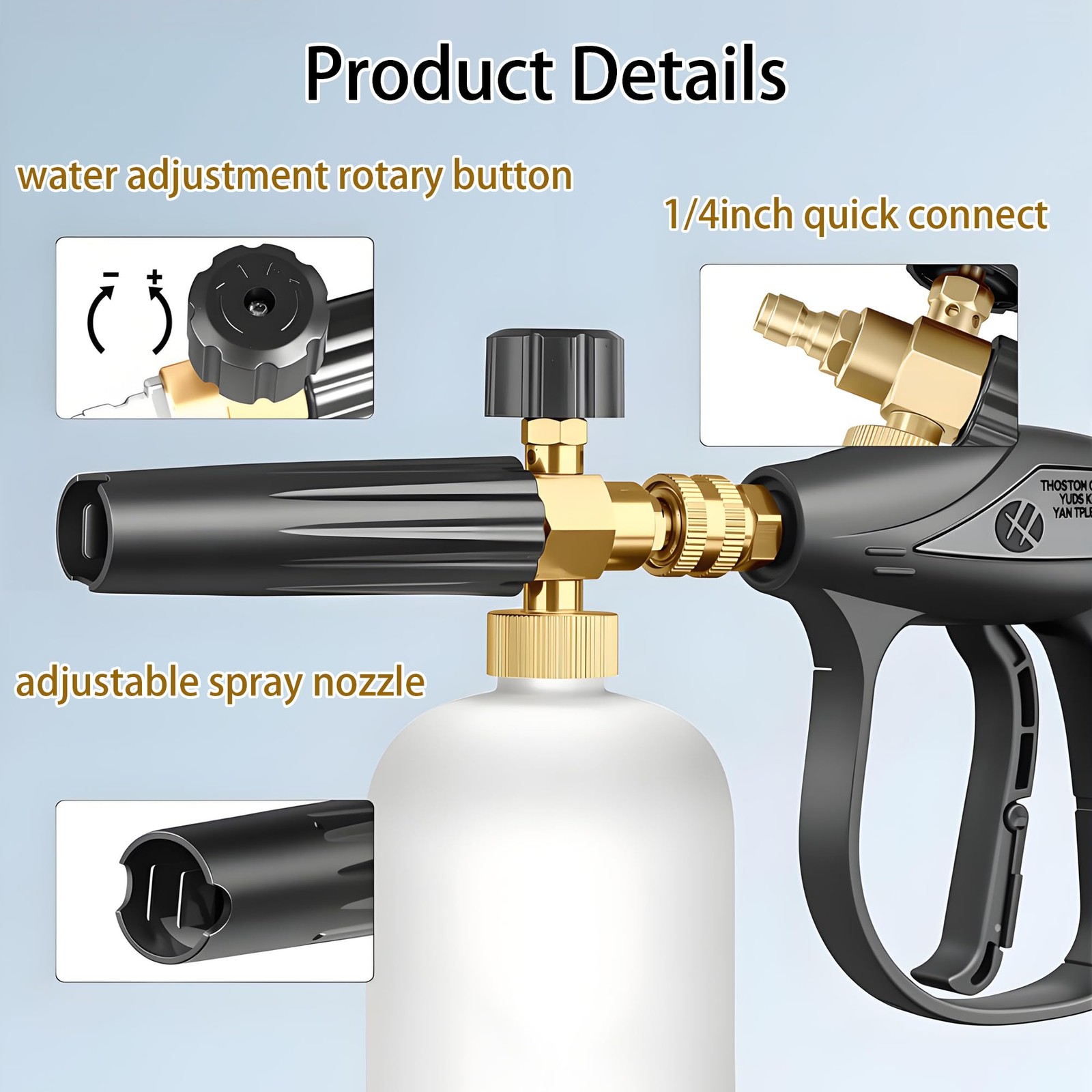 3-in-1 Foam Cannon Kit: 3-in-1 foam cannon with pressure washer gun and dual connector accessory. heavy duty foam cannon made with seamless solid metal foam core, designed for durable use. Snow foam cannon capacity: 1 Liter / 0.26 Gallon; Working pressure: 1000-4000 PSI. NOTE: Foam Cannon Pressure Washer Gun Not Fit Garden Hose Or Water Hose! MULTIPLE CHOICE CONNECTOR: versatile tool features a unique design with two different connector ends - a longer one for the power washer nozzle and a shorter one for the snow foam lance. This strategic arrangement ensures unobstructed water flow when using the nozzle, even with the foam dispenser connected. INNOVATIVE APPROACH TO PRESSURE WASHING: Transform your cleaning routine with our innovative foam blaster dual-connector accessory, designed to connect a pressure washer nozzle and snow foam canon simultaneously. 4350PSI DUAL ADJUSTABLE SPRAY FAN FOAM CANNON - foam cannon is very effective when you need to remove ingrained dirt, dual adjustable spray fan for vertical and horizontal adjustments, wide fill canister to prevent tips and spills, great choice for car washing and cleaning. Container Capacity: 1 Liter / 0.22 Gallon. Specification: 1000 PSI to 4350 PSI. QUALITY MATERIAL: Constructed from premium-grade materials, our power washer foam cannon connector promises exceptional durability and reliability for prolonged use. It's designed to be compatible with most pressure washers and foam sprayer in the market, making it a universally useful tool for a wide array of cleaning applications.