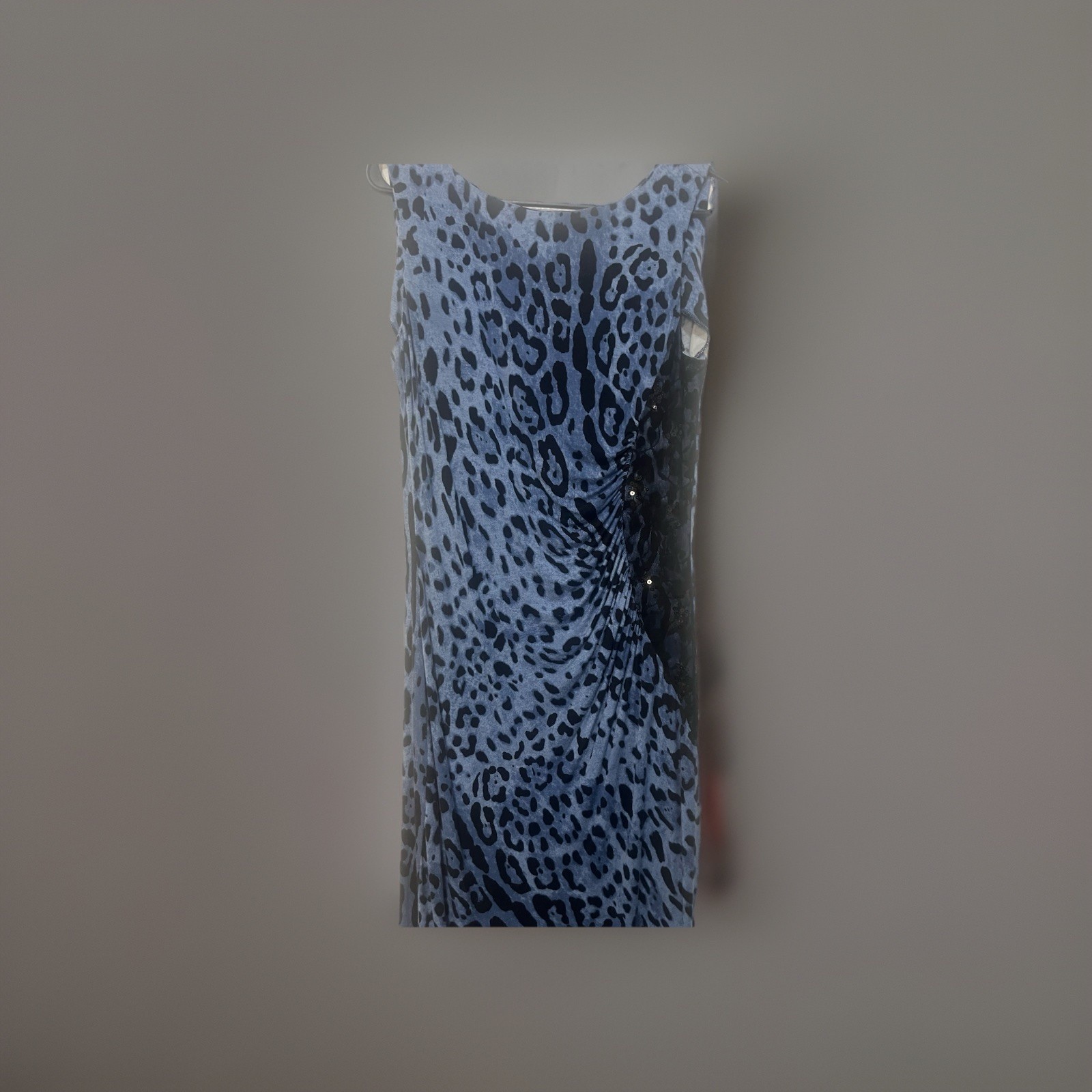 The Focus 2000 Women's Elegant Dress in size M features a stylish animal print pattern in blue and black. This sleeveless dress has a round neckline and a zip closure for easy wear. Suitable for various occasions like weddings, parties, casual wear, formal events, and business gatherings, this midi-length dress is made from a comfortable blend of spandex and rayon, with lace and sequin accents adding a touch of sophistication. Detailed with stretch fabric for added comfort and a flattering fit, this elegant dress is perfect for making a chic statement at any event. CHEST 28 inch Length 41 inches top of shoulder to bottom hem SUPER SOFT