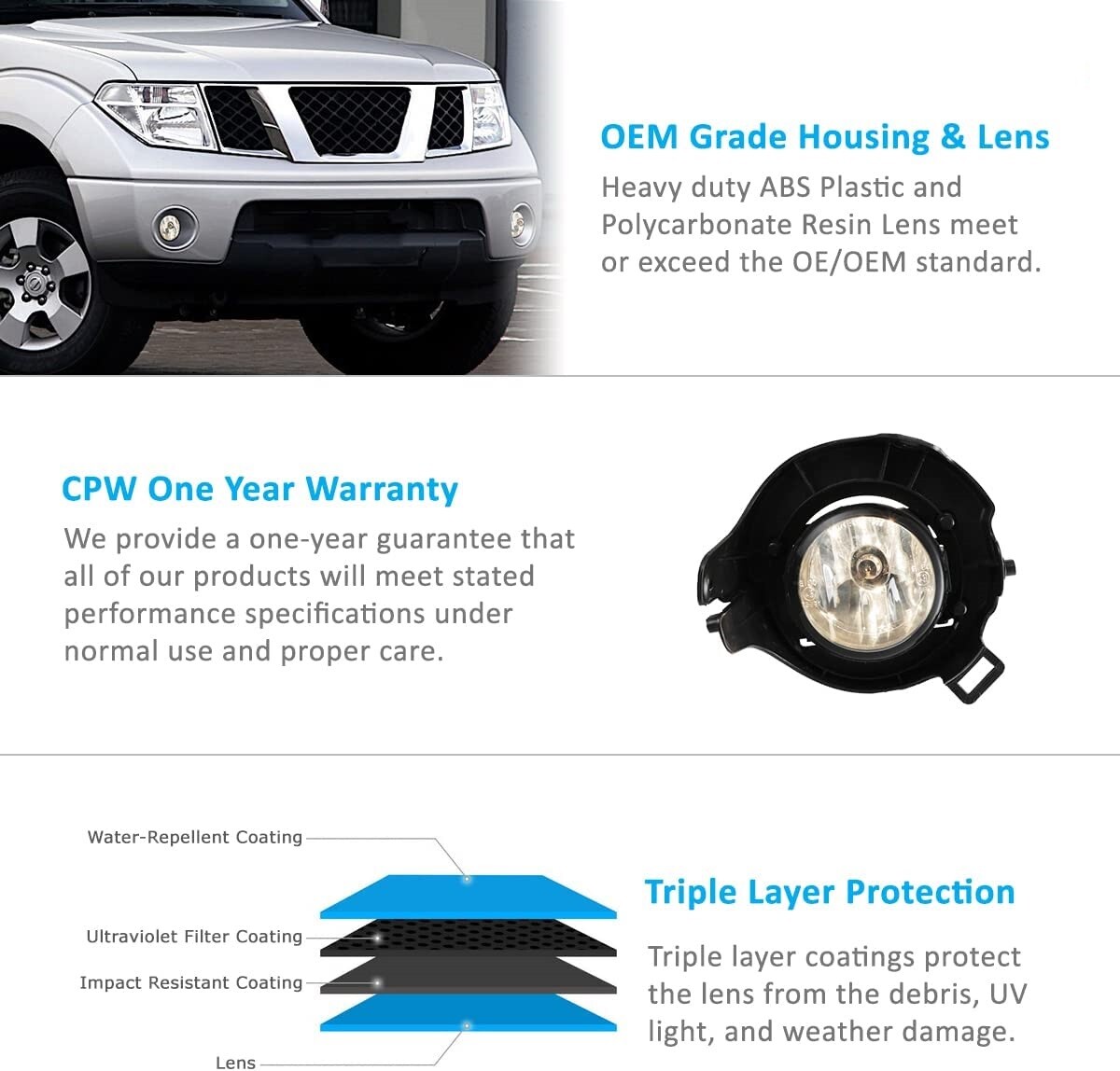 Specifications: Bulb: H11 12V 55W Wiring Harness: Not Included Certification: DOT/SAE Color Finish: Black housing w/clear lens/ chrome reflector Replaces Original (OE) Part #: L: 26155EA525, R: 26150EA525 PARTSLINK: L: NI2592120, R: NI2593120 Fitment: Compatible for 2005-2009 Nissan Frontier (With Painted Bumper) 2005-2012 Nissan Pathfinder (With Painted Bumper) Package Includes: 1 Pair of Fog Light and bulbs Note: All of the items in our shop will come to you with the tracking number.