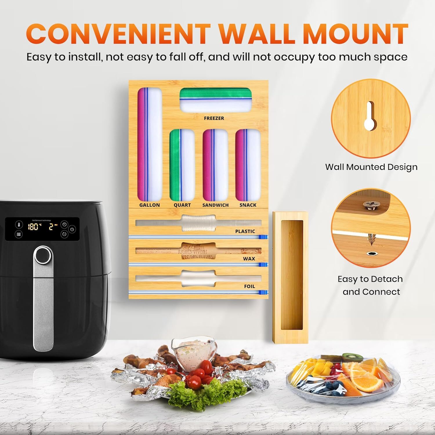 Bag Storage Organizer with Foil and Saran Wrap Dispenser With Cutter Natural Product Details Color: Natural Material: Bamboo Product Dimensions: 6.3"L x 12.2"W x 13.5"H Item Weight: 5.9 Pounds Brand: mHomeBilt 9 IN 1 Baggie & Wrap Organizer: This aluminum foil organization and storage set comes with a 3 in1 foil and plastic wrap organizer with cutters perfect for foil, plastic saran wrap, and wax paper. Transform Your Kitchen: Elevate your kitchen look with our premium 9 in 1 storage bag organizer that comes with a built-in tin foil, saran wrap and wax paper dispenser holder! Our plastic wrap dispenser with cutter is crafted with durable MOSO bamboo leaving a timeless look. Fits Major Brands and Rolls: Our 9 in 1 food storage bag organizer for drawer is compatible with Hefty, Glad, Up&Up, Great Value, and other major brands. Keep in mind that it will only fit rolls up to 12 inches. Detachable & Connectable: The drawer organizer for food storage bags and foil is designed to fulfill all your storage requirements. Connect it and put onto your walls or detach for placement on drawers or countertops. Take control of organizing wrap rolls and baggies your way! Upgraded Foil Cutter & Labels Included: Our upgraded slide cutters effortlessly cuts your desired size of foil with precision and no worry of rolls being crunched up. We’ve also included an assortment of labels to help identify your wraps or bags easier.