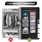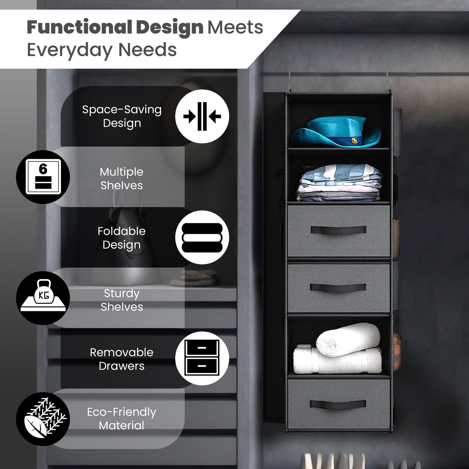 Maximize Closet Space with Our 6-Shelf Hanging Organizer! Declutter your wardrobe with six spacious shelves, three removable drawers with dividers, and six side mesh pockets—perfect for clothes, accessories, and more. Designed for easy access and versatile use, it’s your all-in-one solution for a neat and organized closet. {Upgraded 2025 Closet Organizers and Storage Hanging} Maximize your wardrobe storage space with our 6 shelf hanging closet organizer. This hanging storage unit is crafted from high-quality, durable non-woven fabric ensuring longevity and an odourless experience. Featuring 6 large hanging closet shelves with open front windows and 3 drawers, this wardrobe organizer provides easy access to your clothes, shoes, bags, and accessories. With 12"D x 12" W x 48"H dimensions, it fits perfectly in any closet making it an essential addition for your bedroom storage or dorm storage. {3 Storage Drawers with Compartments} This hanging closet includes 3 removable closet hanging drawers, offering a separate private space for smaller items such as underwear, socks, ties, towels, belts, and baby clothes. These drawers can be attached to the main unit or used separately as storage cubes. Additionally, each drawer includes dividers, providing versatile clothing storage options. Our versatile hanging closet organizer with drawers can be used in walk-in closets or as part of a portable wardrobe system. {Extra Storage with Mesh Pockets} Our versatile kids closet organizer and storage is designed with extra storage in mind, featuring six spacious mesh pockets that are perfect for teddy storage, baby clothes storage, or other child stuffed animals storage. Each pocket is crafted for easy access and visibility, making it simple for children to find and put away their favorite toys. These mesh pockets can also function as hanging storage pockets or an over the door organiser, maximizing space while adding a playful touch to any kids wardrobe, bedroom, or playroom. {Durable & Easy to Install} Enjoy a hassle-free installation process with sturdy metal S hooks. This hanging shelf unit is designed for long-term use, ensuring a reliable and odor-free storage wardrobe solution. Our hanging clothes organizer, made of breathable material, offers consistent performance and dependable quality for all your clothes storage and organizing needs. {Ideal Organization for Any Space} Whether optimising a baby’s nursery, a college dorm room, or organizing your bedroom closet, our closet hanging shelves offer easy-access compartments and drawers to keep everything neatly in place. This closet hanging organizer is ideal for storing sweaters, clothes, shirts, underwear, socks, hats, towels, bedding, accessories, child supplies, toys, and more—perfect for creating a clutter-free clothing storage system.