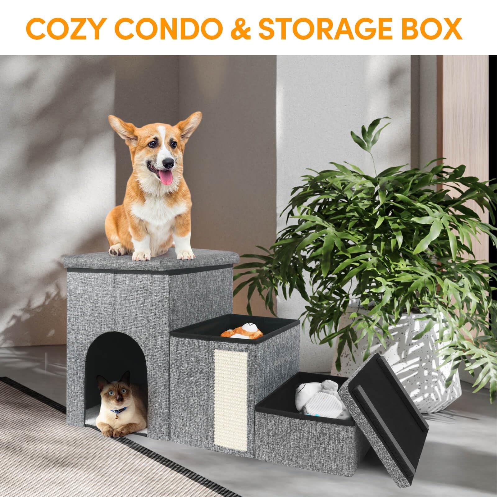 It can be difficult for some dogs to jump up or down from high surfaces due to their size or breed. Jumping can put a lot of strain on a dog's joints and can lead to injuries or exacerbate existing conditions like arthritis. Using stairs can also be helpful for older dogs or dogs with mobility issues, as it allows them to climb up or down at a more gradual and comfortable pace. foldable dog stair with storage box provide a helpful and practical solution for many families with dogs. The stair itself is made of high-quality materials, ensuring that it is sturdy and durable enough to support pets of all sizes. Foldable design allowing it to be easily stored in a closet or under a bed when not in use. Storage space keeping dog toys, treats, leashes, and other accessories organized and easily accessible. Sleek and modern look that will complement any home decor. 【STORAGE & CONDO】Combine the pet stairs, cozy condo, storage space, and cat scratcher in one. The first 2 steps of the pet stairs are designed as a storage box where you can put dog toys, food, clothes, or other pet supplies. The third step can be used as a condo for cats or puppies. There is also a cat scratcher for your cats. 【COLLAPSIBLE & STURDY】The dog stairs can be easily assembled. All pieces fit neatly folded and stacked under a bed or sofa. The pet steps can support up to 130 lbs, and we have added fixed plates for more stability, ensuring pet ramp remain stable without any wobbling 【ADJUSTABLE HEIGHT】Prodcut size: 29.9" L x 12.9" W x 17" H. Three adjustable heights ( 5.9 inch, 11inch and 16.7inch ) . You can use Velcro to separate the steps and adjust the height. Perfect for couch, bed, windowsill or stool. Please make sure the size matches your needs before purchasing. 【UNIQUE DESIGN】Double-sided mat perfect for summer and winter; non-slip bottom for more stable; wear-resistant fabric makes it more durable. 【CARE YOUR PETS】Jumping increases the load on the joint of pets, and hard indoor surfaces can have more of an impact on their joints. Using pet stairs to help young or elderly pets, short-legged dogs and pets with joint or knee problems climb up to their favorite spot.