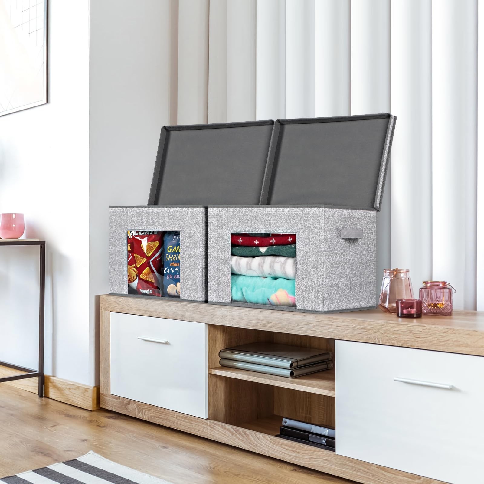 Durable & Sturdy Construction Built to last, these storage bins feature reinforced cardboard frames and high-quality, non-woven fabric. They maintain their shape even when fully loaded, ensuring your items are well-protected. The sturdy lids snap securely in place to keep dust out. Maximize Your Space With generous dimensions of 17''L x 12''W x 12''H, these large bins offer ample space for clothes, blankets, books, and more. Their clever collapsible design means they fold down flat in seconds when not in use, saving up to 80% of storage space. Perfect for seasonal item rotation! Versatile Organizer for Every Room - Bedroom: Ideal for organizing sweaters, scarves, and accessories in your closet or under the bed. - Living Room: Neatly store remote controls, magazines in stylish cube storage box. - Office/Study: Keep files, stationery, and craft supplies tidy and within easy reach. 【Durable & Sturdy Construction】- Built to last, these lidded storage bins feature reinforced cardboard frames and high-quality non-woven fabric. The collapsible storage cubes maintain their shape even when fully loaded, ensuring your items are well-protected. 【Maximize Your Space】- 10 gallon / 40 litre huge capacity, With generous dimensions of 17''L x 12''W x 12''H, these large clothing storage bins offer ample space for clothes, blankets, books, and more. Their clever collapsible design means they fold down flat in seconds when not in use, saving up to 80% of storage space. 【User-Friendly Design 】 - Equipped with a clear see-through window, this closet storage enables easy visibility of contents for efficient organization and quick access. The sturdy handles on the sides enhance portability, allowing for effortless lifting and moving. 【Easy to Use & Maintain】- Setting up is a breeze – no tools required! Simply unfold the closet storage boxes and put the included baseboard for instant stability. The sturdy flip lids for quick access snap securely in place to keep dust out. The fabric is easy to wipe clean with a damp cloth, ensuring your organizers always look fresh. 【What You Get & Our Promise】- Your order includes 4 large fabric storage bins with lid in a sophisticated Gray color. We are confident in the quality of our closet organizers. If you have any issues, our friendly customer service team is here to help.