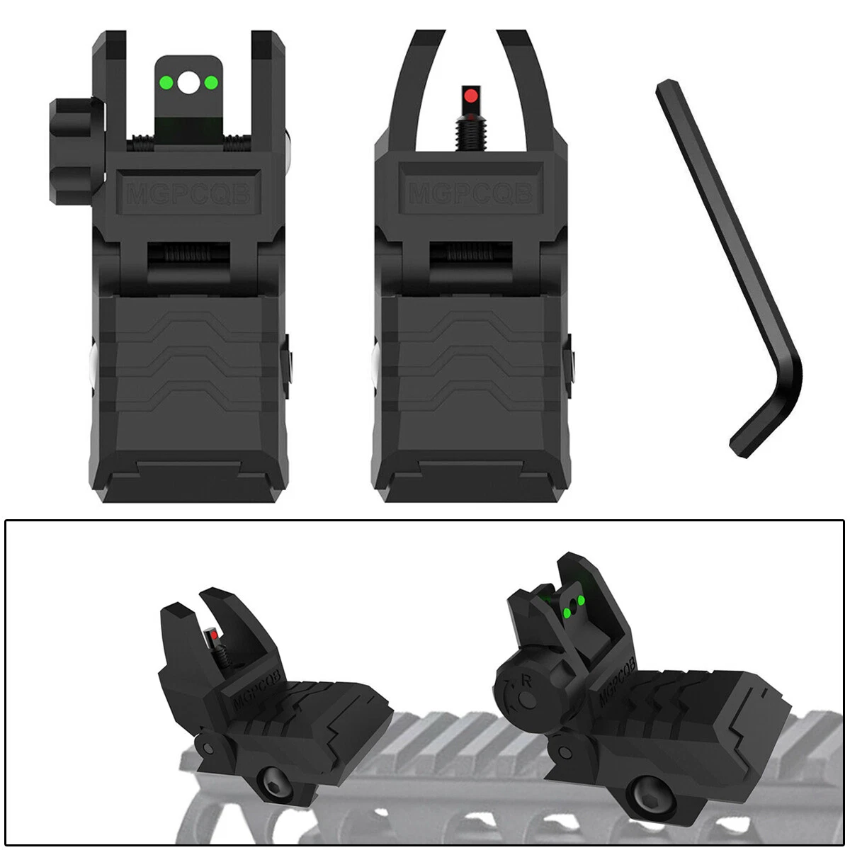 Color: Black Interface: Picatinny / Weaver Rails Compatible with: most 20mm Picatinny/Weaver rails MPN: Does Not Apply Model: Fiber Optics Iron Sights Type: Sights Material: Nylon, Resistant High-density polymer Modified Item: No Features: Adjustable, Folding Mounting Location: Rail Not suitable for: railed gas blocks Sport/Activity: Hunting Brand: Unbranded
