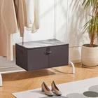 The dimensions of the shoe storage box are 26.5*16.5*13 inches, with 20 compartments capable of accommodating up to 20 pairs of shoes. Each compartment measures 5.2*4.2 inches, suitable for use in bedrooms, garages, basements, and dormitories. The dimensions of the shoe storage box are 26.5*16.5*13 inches, with 20 compartments capable of accommodating up to 20 pairs of shoes. Each compartment measures 5.2*4.2 inches, suitable for use in bedrooms, garages, basements, and dormitories. While a shoe rack is convenient, it lacks dust protection. This shoe storage box is equipped with a transparent lid at the top, allowing easy identification of contents and preventing dust from entering. Utilizing cationic fabric, it exhibits outstanding dust resistance and moisture-proof properties. With three fixed handles and reinforced cardboard side panels and base, this shoe storage box ensures that it maintains its shape even under pulling or other pressures.