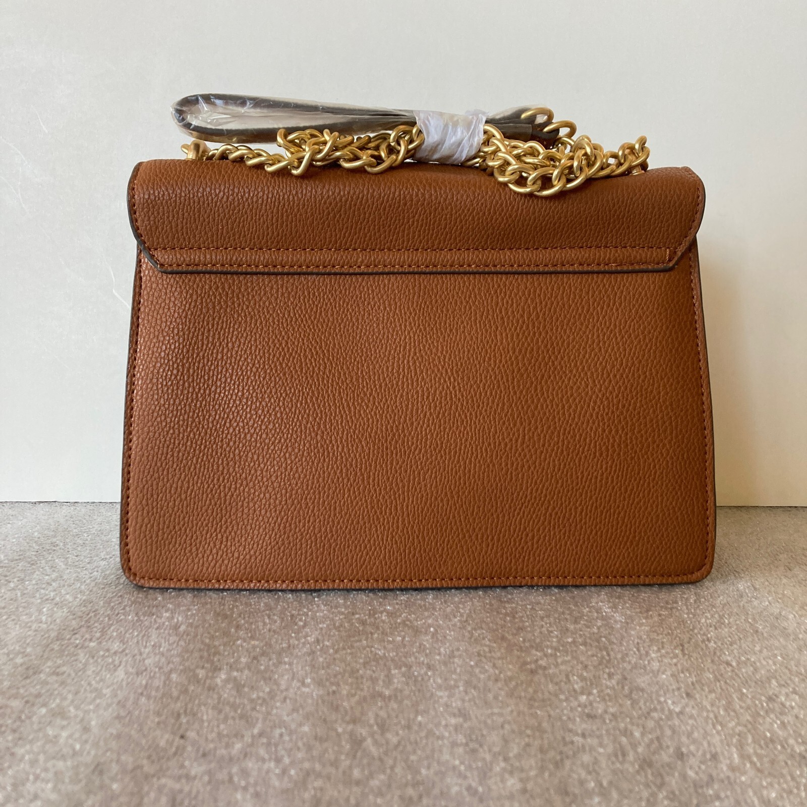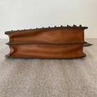New with tags- there is one small discoloration spot on the interior lining. See up close photo. Original MSRP 128.00 Brown peppled leather with black studs. Gold tone chain strap. 10" wide x 7.5" high
