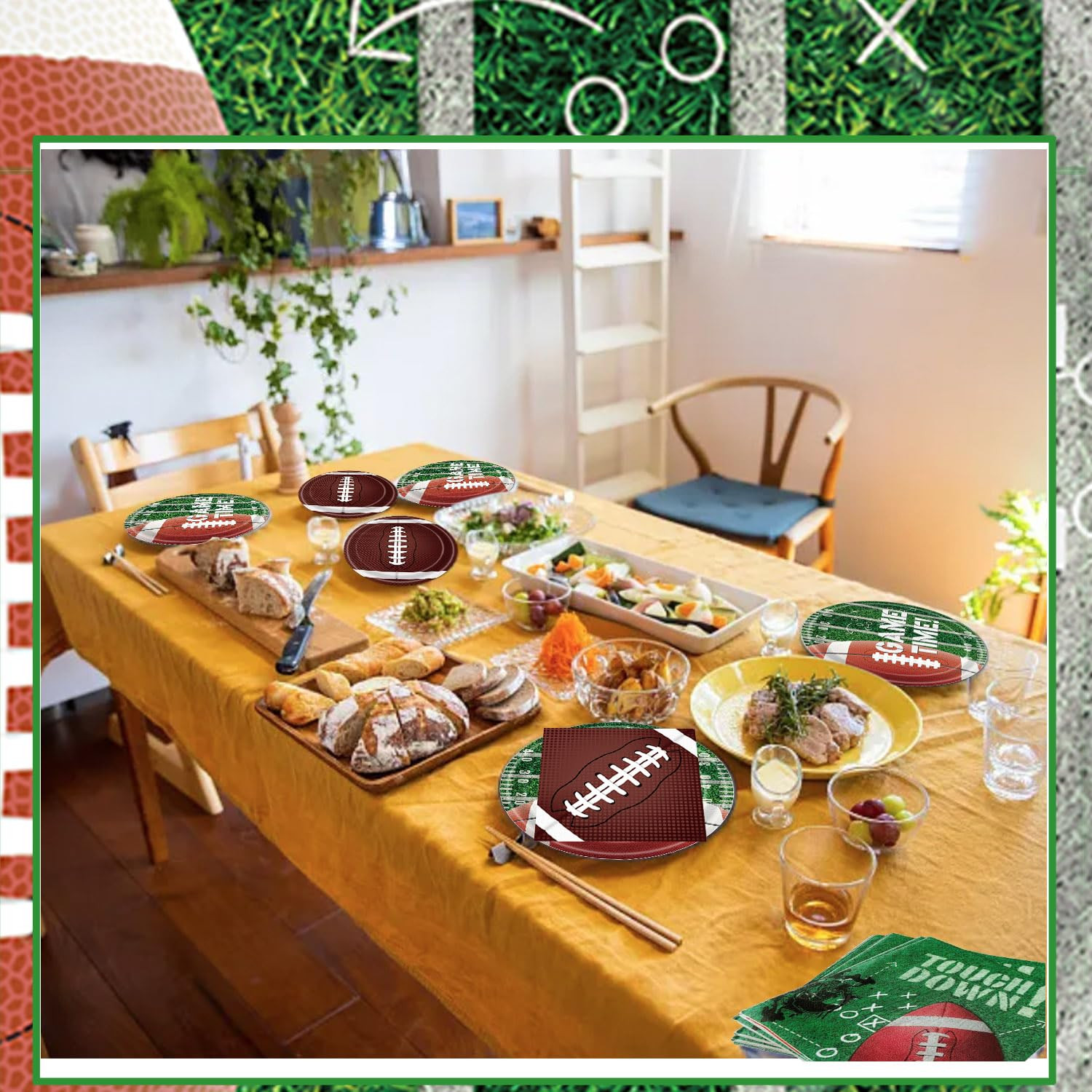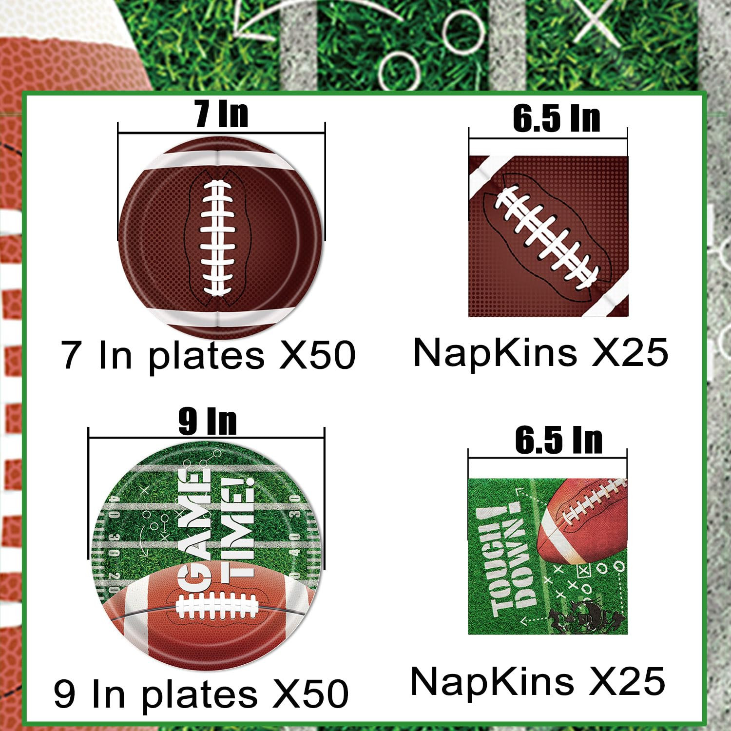 Complete Set: Includes 50 dinner plates, 50 dessert plates, and 50 napkins for a football-themed party. Party Theme: Perfect for football birthdays, gameday celebrations, and tailgating events. Disposable Dinnerware: Plates and napkins are made of high-quality paper for easy cleanup. Serves 50 Guests: Ample supplies for a large gathering or party. Decorative Design: Plates and napkins feature a football-inspired pattern for a festive atmosphere.