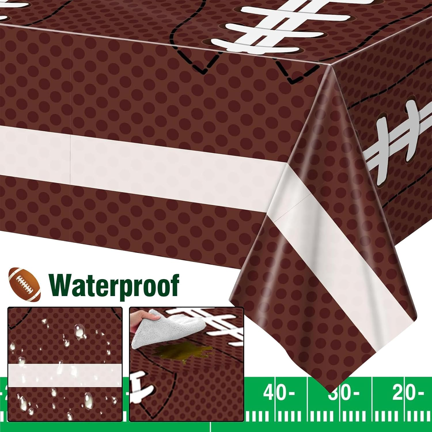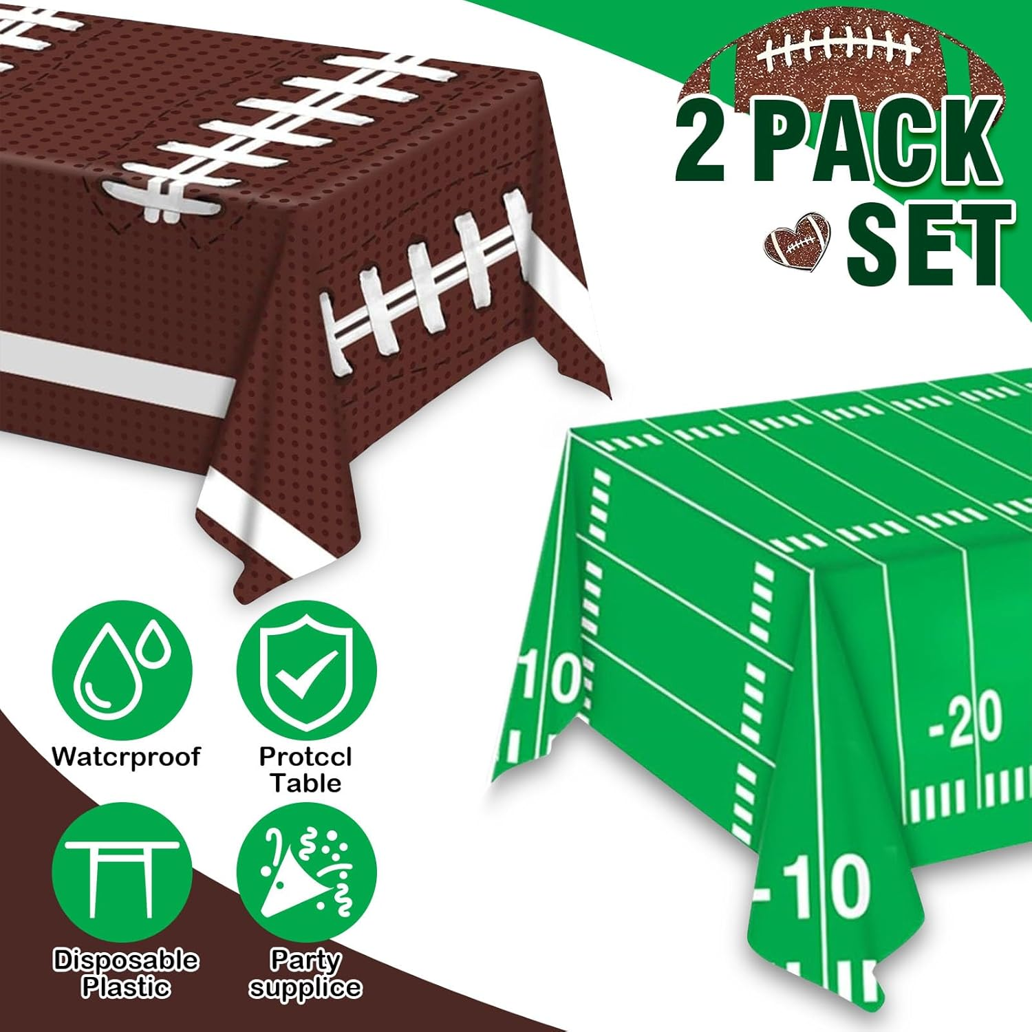 【Football Design】: Elevate your game day celebrations with our uniquely designed football tablecloths featuring yard numbers and classic football patterns. These tablecloths are perfect for Super Bowl parties, tailgates, birthdays, and any event that brings together football fans of all ages. Their vibrant design will enhance the festive atmosphere and impress your guests. 【What You Can Get】: This set includes two disposable tablecloths: one with a soccer field design and another featuring a soccer pattern. Each tablecloth measures 54 x 108 inches, providing ample coverage for your tables. With two distinct styles, you can create a dynamic and exciting football-themed environment for your gathering. 【Easy to Clean】: Designed for convenience, these football-themed tablecloths feature a waterproof and oil-proof surface that effectively protects your tables from spills and messes. After the festivities, simply roll them up and dispose of them for hassle-free cleanup. 【Quality Material】: Crafted from high-quality PE plastic, these tablecloths are both lightweight and durable. Their sturdy construction ensures they won't tear easily, and their waterproof nature keeps your tables safe from leaks and stains. 【Party Theme Application】: The football design seamlessly complements a variety of entertainment settings, making it ideal for Super Bowl parties, tailgate events, and football-themed birthdays. Create a memorable experience for kids and adults alike with these attractive table covers that celebrate the spirit of the game. Product Description