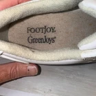 The Footjoy Greenjoys Women's Golf Shoes in White Beige are designed for athletic performance on the golf course. Featuring a low top style with a lace-up closure, these spikes offer the necessary traction for a secure fit during play. Made of leather with a solid color pattern, these shoes are not vintage and are ideal for summer, fall, and spring seasons. The FootJoy brand is known for quality athletic footwear, making these shoes a reliable choice for golf enthusiasts.