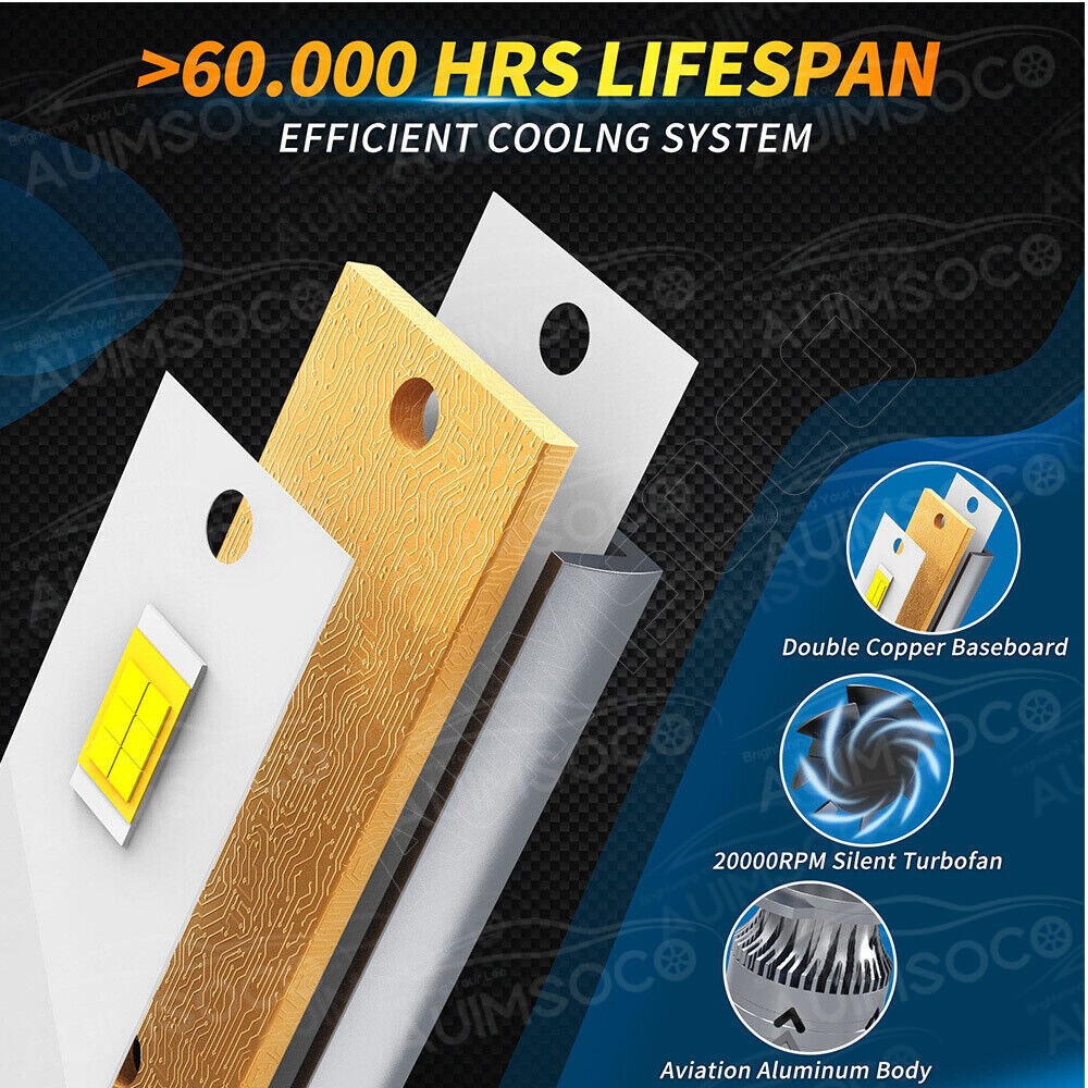 Home Payment Shipping About us Contact us Details About this item 300% Brightness : With 80W and 8000 lumens per LED bulb, AUIMSOCO LED Light Bulbs are boasting a 300% increase in brightness compared to traditional halogen bulbs. AUIMSOCO 9005 H11 LED Light Bulbs boast an integrated hollow heat sink and fan that work together to maintain optimal performance. Extended +50,000 Hour Lifespan : AUIMSOCO 9005 H11 Light Bulb unique design features a hollow heat sink and 15,000 RPM turbo cooling fans that effectively dissipate heat from the AUIMSOCO LED Light beads, allowing 9005 LED Blubs to last up to 50,000 hours. Easy Installation in Just 5 Minutes : AUIMCOSO 9005 H11 LED Light Bulb fit perfectly into your auto light housing without any modification. Simply plug in one connection point to your vehicle's light housing and you're good to go. Plug-and-play design makes the swap be a simple task. 95% Universal Compatibility : 9005 H11 LED Bulb are designed to fit 95% of vehicles' computers without throwing any error. Plus, with built-in driver and CANbus ready design, you don't need a separate adapter. The filter system may not be 100% accurate, please please contact us with Ebay Buyer Message to get help and solutions 1:1 Perfect Beam Pattern Design : LED Light Bulbs precisely mimic the position of the original halogen filament to ensure a perfect beam pattern. This enhances visibility in front of your vehicle, providing you with a wider driving vision and cutting down on glare in poor visibility. Specification: To Fit: Headlight Bulb Size: 9005 H11 Fit: Motorcycle, Motorbike, Bike, car, van, truck, pickup Sealed Housing: IP68 Voltage: DC 9-32V(fit 12V, 24V vehicles) Heat Control: A380 Aluminum Body With Built-In Turbo Cool Fan Type: Direct Replacement Lifetime: Over 50,000 Hours Color Temperature:6500K External Testing Certification: CE / Rohs / IP68 Number of Bulbs: 4 Chips Type: CSP LED Lighting Type: Specialty Head Light Bulb Beam Angle: 270 degree, low beam, 360 degree, high beam Material: Aviation 6063 aluminum profile Waterproof: IP68 rated water and dust seal Operating Temperature: -45-150 degree Celsius Connector Type: Plug and Play Install Caution: 1. As a safety precaution, make sure that the car has had time to cool down properly before starting the installation process. 2. Put the vehicle into park or make sure it is securely in gear. 3. Make sure to have the ignition turned off and the keys removed. 4. Be careful to avoid burns, especially when turning on or off the vehicles lighting. 5. Be careful to avoid crushing or cutting the bulbs. Also make sure to not touch the bulbs with your fingers, as this will cause blotting. 6. Fully examine the connection of the contact points, ports and the wires as faulty connections can cause lighting problems. 7. Make certain that the end of the bulb does not come in contact with the interior light shield of the headlight when adjusting the bulb. Packge include: 4 x 9005 H11 LED Headlight Bulbs New and old packaging will be shipped randomly!! Shipping Policy Payment Method Returns Policy Shipping Policy Payment Method Returns Policy Home Payment Shipping About us Contact us Store Categories Store Categories LED Headlights H7 H8/H9/H11 9003/H4/HB2 9004/H3 9005/HB3 9006/HB4 9007 9008/H13 LED Fog/Driving Lights H8/H9/H11/H16JP H10/9145/914 H16/5202 9005 9006 880/890/899 881/886 H3 Tools & Stickers For Ford ICE BLUE 8000K WHITE 6000K For Chevy ICE BLUE 8000K WHITE 6000K For GMC ICE BLUE 8000K WHITE 6000K For Dodge WHITE 6000K ICE BLUE 8000K For Ram ICE BLUE 8000K WHITE 6000K For Honda WHITE 6000K ICE BLUE 8000K For Toyota ICE BLUE 8000K WHITE 6000K For Nissan WHITE 6000K ICE BLUE 8000K For Subaru ICE BLUE 8000K WHITE 6000K For Jeep WHITE 6000K ICE BLUE 8000K For Acura ICE BLUE 8000K WHITE 6000K For Mitsubishi WHITE 6000K ICE BLUE 8000K For Cadillac ICE BLUE 8000K WHITE 6000K Other Details About this item 300% Brightness : With 80W and 8000 lumens per LED bulb, AUIMSOCO LED Light Bulbs are boasting a 300% increase in brightness compared to traditional halogen bulbs. AUIMSOCO 9005 H11 LED Light Bulbs boast an integrated hollow heat sink and fan that work together to maintain optimal performance. Extended +50,000 Hour Lifespan : AUIMSOCO 9005 H11 Light Bulb unique design features a hollow heat sink and 15,000 RPM turbo cooling fans that effectively dissipate heat from the AUIMSOCO LED Light beads, allowing 9005 LED Blubs to last up to 50,000 hours. Easy Installation in Just 5 Minutes : AUIMCOSO 9005 H11 LED Light Bulb fit perfectly into your auto light housing without any modification. Simply plug in one connection point to your vehicle's light housing and you're good to go. Plug-and-play design makes the swap be a simple task. 95% Universal Compatibility : 9005 H11 LED Bulb are designed to fit 95% of vehicles' computers without throwing any error. Plus, with built-in driver and CANbus ready design, you don't need a separate adapter. The filter system may not be 100% accurate, please please contact us with Ebay Buyer Message to get help and solutions 1:1 Perfect Beam Pattern Design : LED Light Bulbs precisely mimic the position of the original halogen filament to ensure a perfect beam pattern. This enhances visibility in front of your vehicle, providing you with a wider driving vision and cutting down on glare in poor visibility. Specification: To Fit: Headlight Bulb Size: 9005 H11 Fit: Motorcycle, Motorbike, Bike, car, van, truck, pickup Sealed Housing: IP68 Voltage: DC 9-32V(fit 12V, 24V vehicles) Heat Control: A380 Aluminum Body With Built-In Turbo Cool Fan Type: Direct Replacement Lifetime: Over 50,000 Hours Color Temperature:6500K External Testing Certification: CE / Rohs / IP68 Number of Bulbs: 4 Chips Type: CSP LED Lighting Type: Specialty Head Light Bulb Beam Angle: 270 degree, low beam, 360 degree, high beam Material: Aviation 6063 aluminum profile Waterproof: IP68 rated water and dust seal Operating Temperature: -45-150 degree Celsius Connec