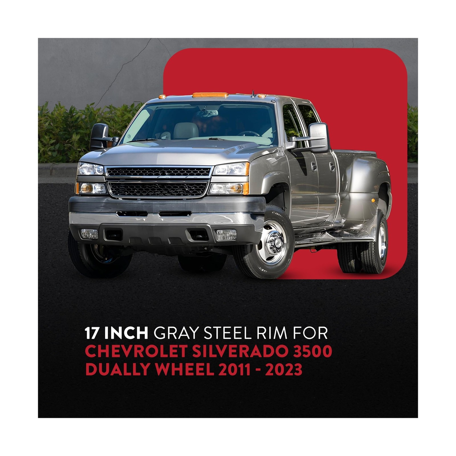 For 2011-2025 Chevrolet Silverado 3500HD - 8 Lug 17 Inch Rim for Chevy Dually Wheels - OE Direct Replacement - Road Ready Car Wheel Description Features: 17 Inch Rims for a Chevy Silverado 3500HD: Designed to factory specifications Road Ready Wheel heavy duty OE replacement 17 inch chevy wheels fit OEM Tire Size: LT235/80R17. The bolt pattern for this tire rim is 8 - 210mm or 8 - 8.3 inches. Fits all your Rim Replacement Needs: Ideal for full swaps, single replacements and full size spares, our aftermarket Chevy Silverado rims 17 inch are suitable for all weather and off road conditions. ram promaster city wheel Easy Installation: Engineered to factory specifications. Road Ready OE replacement Silverado wheels are easy to install and compatible with all OEM equipment. These 17 inch dually wheels To ensure exact wheel fitment, confirm the correct tire size. Heavy Duty Steel Rims: Perfect for off-road driving, heavy hauling, or long distance travel. Note: our aftermarket Chevy Silverado wheels do not include a tire, TPMS sensors, lug nuts, valve stems or wheel covers. Suitable for All Seasons: Our OE replacement 8 lug Chevy rims feature a powder coating resistant to rust and chipping. All Road Ready wheels and rims are suitable for all seasons and work well for off-road driving conditions. Product Details: Size: Fits: 2011-2025 Chevrolet Silverado 3500 - 17x6.5 Exterior Finish: Painted/Gray Brand: Road Ready Wheels Wheel Size: 17 Inches Material: Steel Pitch Circle Diameter: 210 Millimeters Wheel Backspacing: 5 Millimeters Rim Size: 17 Inches Item Weight: 44 Pounds Item Diameter: 17 Inches Size: Fits: 2011-2025 Chevrolet Silverado 3500 - 17x6.5 Brand: Road Ready Wheels Wheel Size: 17 Inches Pitch Circle Diameter: 210 Millimeters Item Weight: 44 Pounds Item Diameter: 17 Inches Vehicle Service Type: C Load Index: 4000.00 Rim Width: 6.5 Inches UPC: 680599309113 OEM Part Number: 09597735 Color: Gray Manufacturer: Road Ready Wheels Seasons: all seasons Automotive Fit Type: Vehicle Specific Fit Model: 560-8094 Item Weight: 44 pounds Item model number: 560-8094 Is Discontinued By Manufacturer: No Manufacturer Part Number: 09597735 Bolt Pattern (Number of Holes): 8 Offset: 135 Millimeters Date First Available: August 23, 2016 Delivery We Do Not Ship Outside of the Continental US. Return Policy All items qualify for returns within 30 days of receipt. Buyer is responsible for return shipping on any item that is not damaged. Feedback We take our reputation seriously, we buy and sell online, so we understand the value of trust. If you are unsatisfied with your order, please contact us and we will work with you to resolve it to your satisfaction.