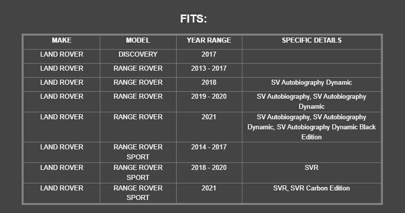 FITS: MAKE MODEL YEAR RANGE SPECIFIC DETAILS LAND ROVER DISCOVERY 2017 LAND ROVER RANGE ROVER 2013 - 2017 LAND ROVER RANGE ROVER 2018 SV Autobiography Dynamic LAND ROVER RANGE ROVER 2019 - 2020 SV Autobiography, SV Autobiography Dynamic LAND ROVER RANGE ROVER 2021 SV Autobiography, SV Autobiography Dynamic, SV Autobiography Dynamic Black Edition LAND ROVER RANGE ROVER SPORT 2014 - 2017 LAND ROVER RANGE ROVER SPORT 2018 - 2020 SVR LAND ROVER RANGE ROVER SPORT 2021 SVR, SVR Carbon Edition