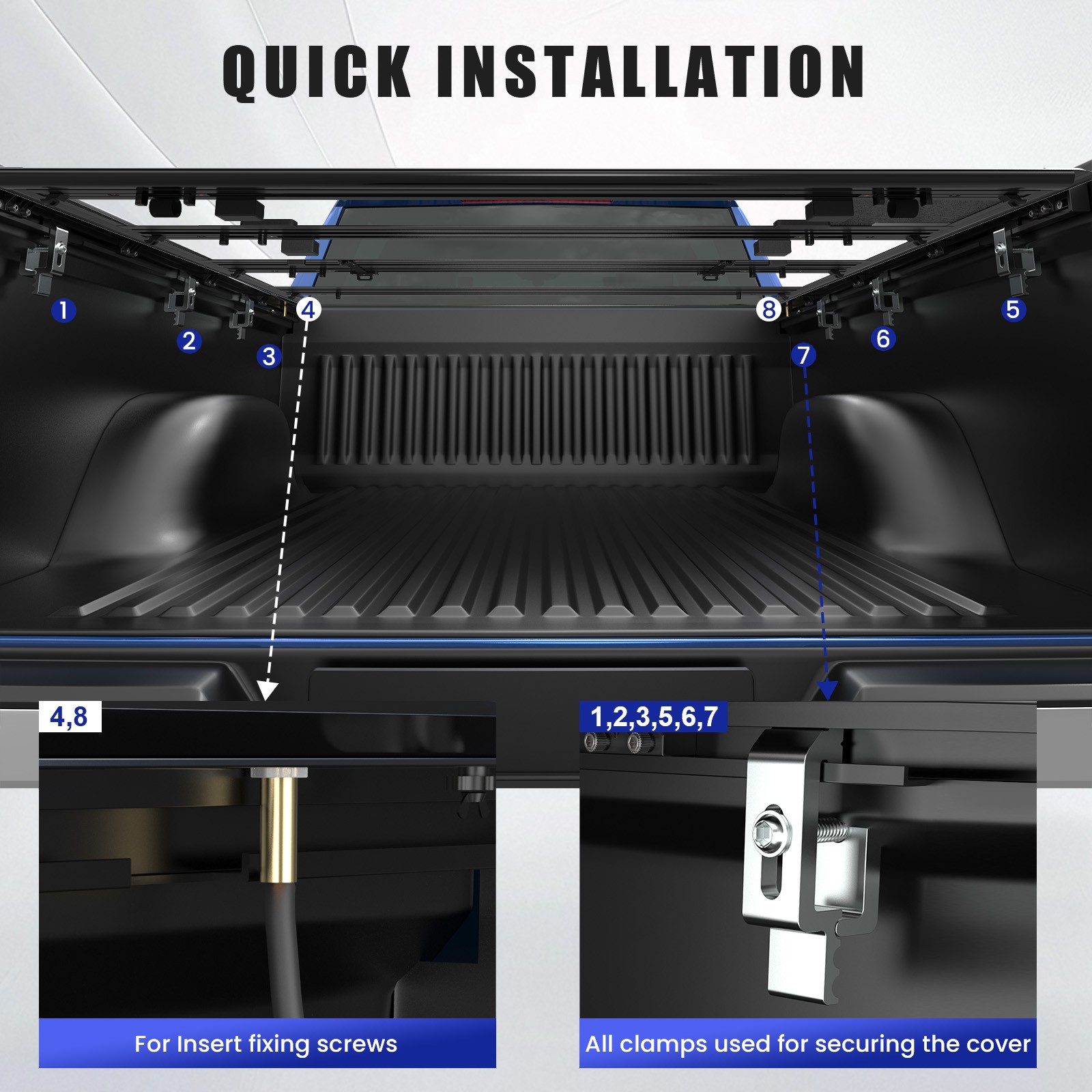 For 2022-2024 Toyota Tundra 5.5FT Low Pro Hard Tonneau Cover Truck Bed Flip Up PRODUCT DESCRIPTION ONE YEAR WARRANTY Please measure your truck bed length and make sure you have the correct model before ordering! Description: Half Low-Profile Fiberglass+PP Tonneau Cover. Withstand kinds of climate conditions, sealing with windproof rain strip, waterproof, snow proof and dirt proof. Easy install, no drilling need. Simply fold from back to front, then lift up . Lightweight design permits easy removal and reinstall. Black textured powder coated face is UV resistant and no fading. Tonneau cover folds easily at the hinges and sits against the back of your cab with rubber bumper protecting the cab of you truck. Provide maximum security and concealment of your goods. Material: Tarp: Made from excellent tensile and tear strength fiberglass material Rails/Frame: Aluminum Item-Offered: Hard Flip-Fold Tonneau Cover x 1 1 Set Clamps(Front Clamps and Side Clamps) Necessary Hardware Include Nut,Wrench Ect. Installation Guide Fitment: For 2022-2024 Toyota Tundra 2WD/4WD 5.5ft SHIPPING RETURN WARRANTY SHIPPING · Shipping time: 1-6 business days in USA · After shipping, the tracking No. available by message · We ship to eBay address RETURN No returns are accepted without an RMA number. · Refund is valid within 60 days after the date delivered · Refund will be given as money back or replacement · The money less the freight cost will be refunded due to their own fault · Item must be returned in original packing same as reached · Buyers are responsible for the return shipping cost. WARRANTY · Buyers pay return and replacement shipping cost · We will not refund any labor cost