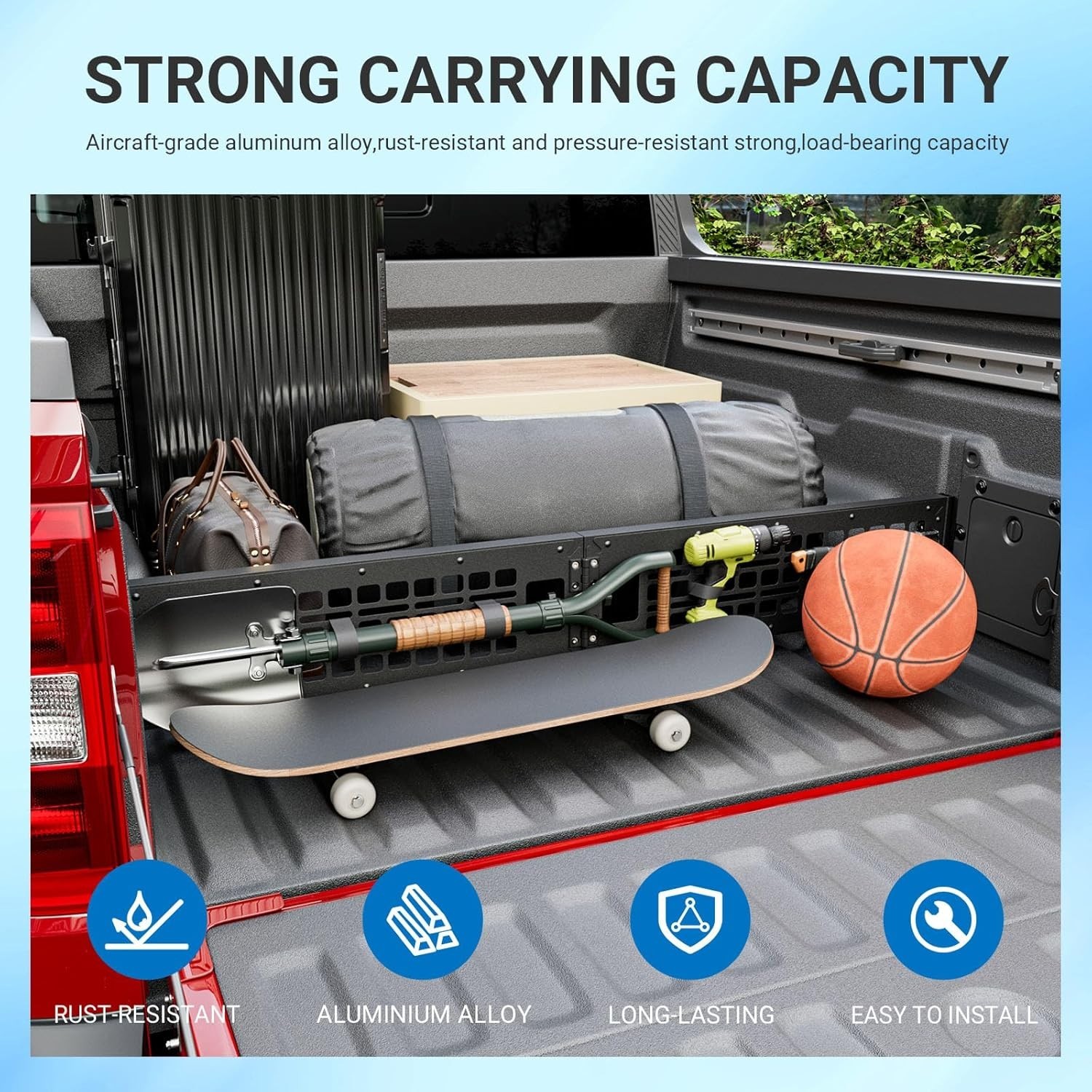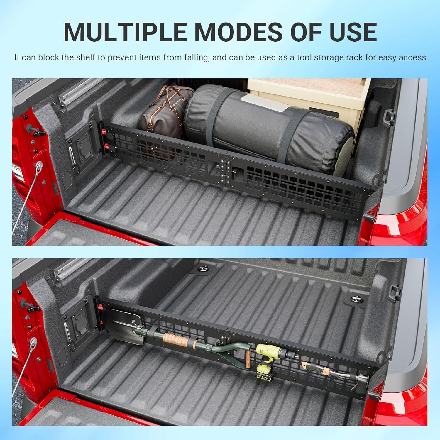 Store Categories Store Categories Other For 2022-2026 Ford Maverick Truck Bed Divider Cargo Manager Molle Panel Truck Product Description 1.Perfect Fit:This cargo bed divider is specifically designed to compatible with 2022 2023 2024 2025 2026 Ford Maverick XLT truck bed divider.NOTE:NOT fit truck bed with bed liner.Please confirm your model carefully before buying. 2.Material:The cargo manager compatible with Ford Maverick truck bed organizer is constructed from aluminum alloy with a matte black finish, the divider offers structural resilience for demanding loads.The corrosion-resistant coating withstands water and abrasion,maintaining a clean appearance over time.The molle panel provides ventilation and visibility while adding lightweight strength. 3.Function:The bed divider is replacement for Ford Maverick cargo manager organize tools, gear, and cargo with confidence.The divider's vertical design and molle panel prevent items from shifting during transit,reducing noise and potential damage.Use it as a dedicated tool organizer-wrenches, straps, or recovery gear can be secured directly to the grid. This setup creates a safer driving experience by keeping heavy objects contained and easily accessible. 4.Easy Installation:The separator compatible with Ford Maverick panel is easy to install and does not require drilling or complex tools. Set up in moments with a simple plug-and-place design. The divider inserts into existing bed. You could check the installation video on the homepage or scan the QR code on the manual. 5.Highlights:Tool-Ready Grid:Molle panel supports hooks,clips,or bungees for custom tool storage.Ventilated Containment:Open design allows airflow while restraining cargo.Space-Efficient Profile: Slim aluminium alloy frame preserves bed space without adding bulk.Scratch-Resistant Finish:Matte coating helps conceal wear from frequent use.If you have questions about the molle panel replacement for 2022 2023 2024 2025 2026 Ford Maverick bed rack,we'll help you as soon as possible. Q&A Q&A Q: May I ask in which part this truck bed divider is installed? A: You could refer to the installation instructions in the manual and install it at the fixed position in the truck. Q: Which vehicle models is it compatible with? A: Yes! The truck bed divider is compatible with 2022 2023 2024 2025 2026 Ford Maverick XLT. NOT fit truck bed with bed liner. Q: Is the divider adjustable or easily removable? A: It can be easily removed when you need full, unobstructed use of your truck bed. Copyright © 2023 Dianxiaomi