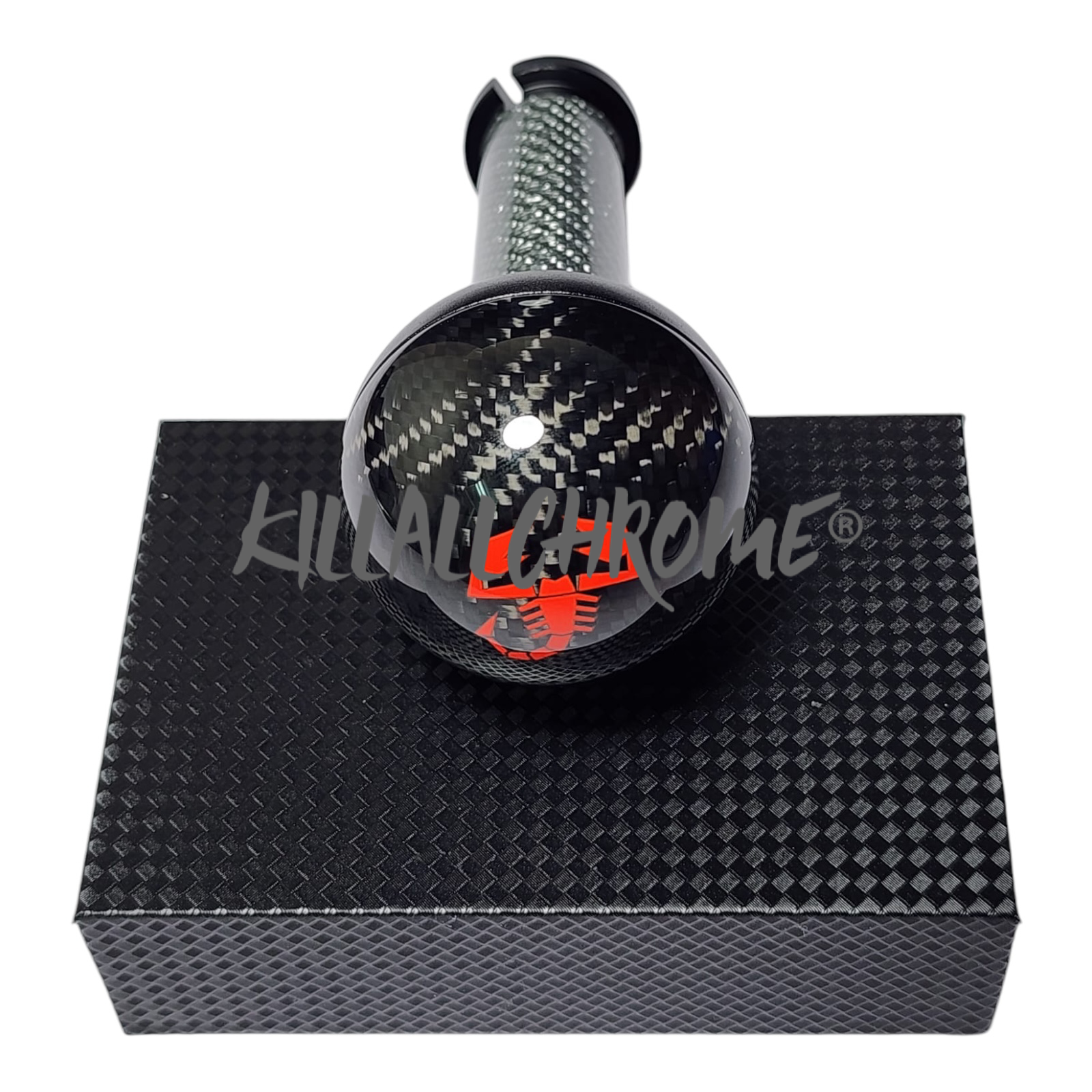 KillAllChrome® KillAllChrome Black Carbon Fibre Gear Knob for Fiat 500 + Abarth Fits all manual models 500 Abarth 595 etc Black with Black Carbon + Red Scorpion Logo with Silver Genuine Carbon Stem This item is made from Titanium and 100% carbon fibre and are NOT carbon look With 6 grub screws and an Allen key included, fitting this gear knob is a simple swap which takes a few minutes, please be gentle when applying the grubs screws and ensure they are in straight before tightening. This is suitable for ALL Manual Fiat, Abarth 500 595 This NEW Genuine Carbon shift comes complete with an installation kit (pictured) and is a direct replacement for your old shift. I Comes in a nice presentation box great for a gift idea