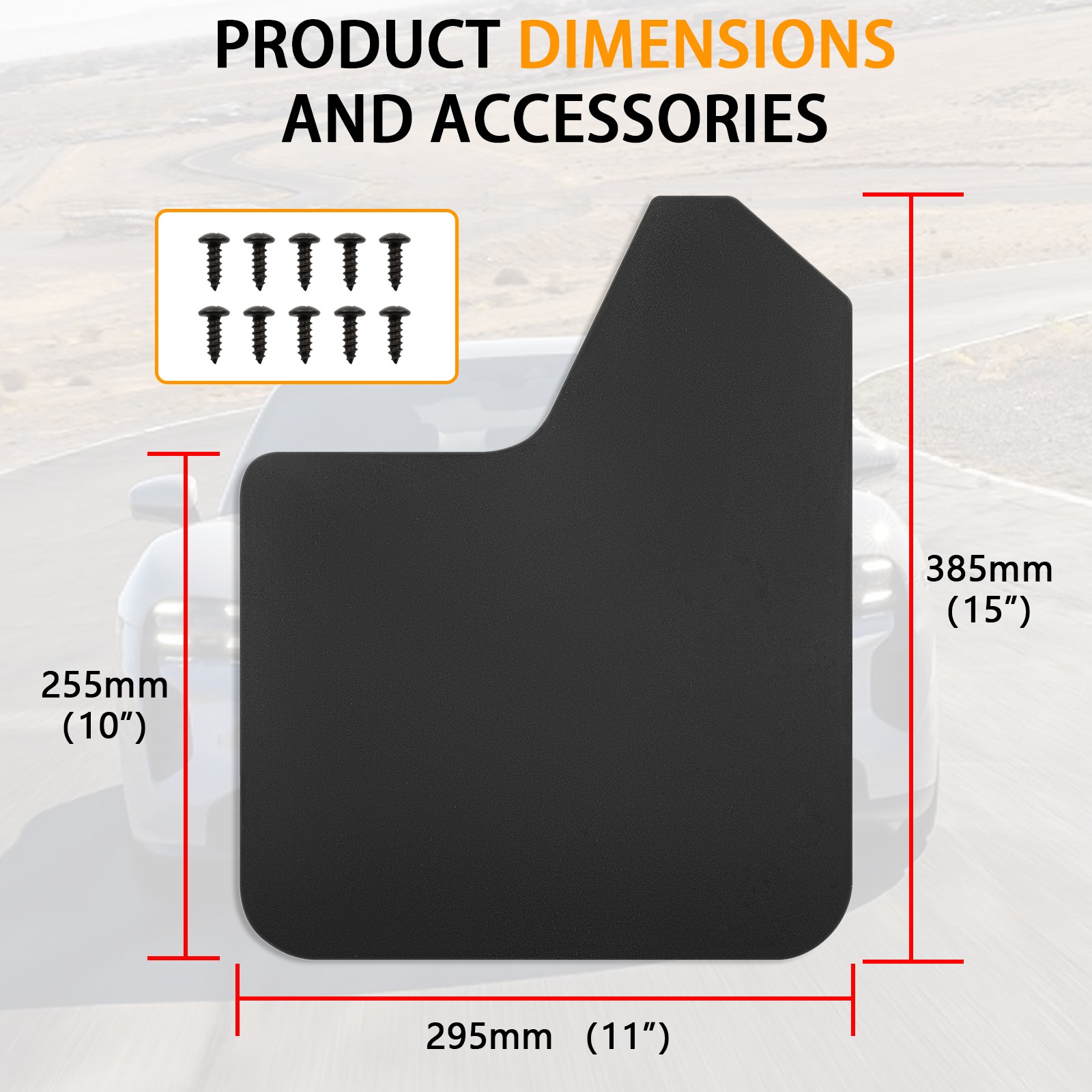Specification Material: PE Quantity: 4Pcs/set Color: Black Package Included 4PCS Mud Flap + Screws accessories 【Premium Material】: Crafted from high-quality, durable plastic, these car fenders are designed to withstand the toughest road conditions. They are thick, wear-resistant, scratch-resistant, heat-resistant, and low-temperature resistant. Their flexibility ensures they won't easily crack, providing long-lasting protection for your vehicle. 【Ultimate Protection】: These car fenders offer maximum protection for your car or truck. Their sturdy structure shields your vehicle from wind, snow, salt, sand, and debris, reducing the risk of dust, road debris, and stone chips hitting your car's body. Rest assured knowing your vehicle is well-protected. 【Keeps Your Car Clean】 : Not only do these car fenders protect against scratches, but they also help preserve the beauty of your vehicle. By blocking mud and water kicked up by the wheels, these durable and wear-resistant mudguards keep your car clean, maintaining its pristine appearance even on high-speed roads. 【Easy Installation】: Installing these car fenders is a breeze, although drilling may be required. Simply follow the straightforward instructions and you'll have them securely in place in no time. 【Universal Fit】 : These car fenders are designed to fit a wide range of vehicles, including SUVs, and trucks. They are flexible and can be easily cut and bent to the desired size, ensuring a perfect fit for your specific needs. Their versatility makes them an excellent choice for any vehicle. On Jan 19, 2026 at 02:12:23 PST, seller added the following information:
