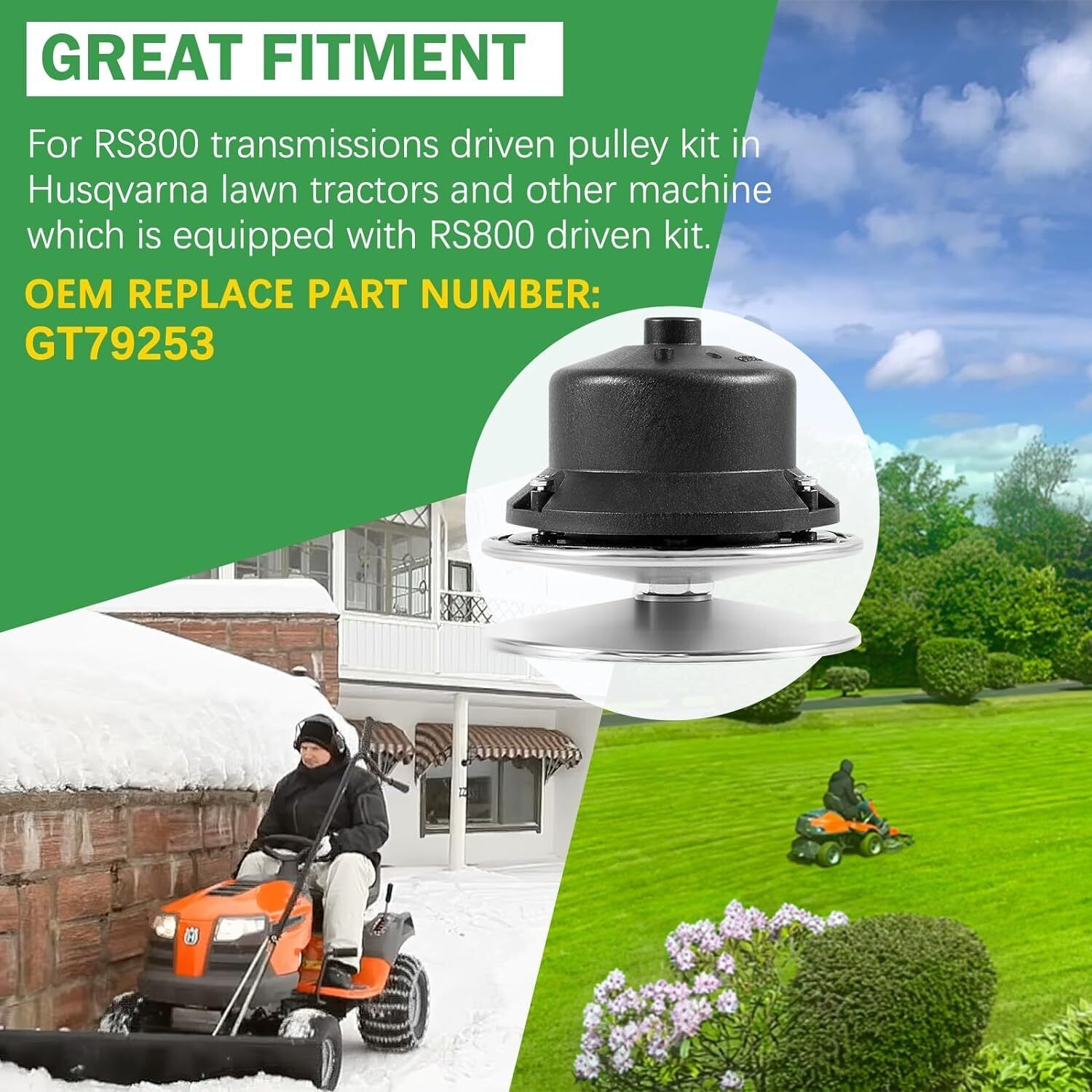 Application GT79253 Driven Kit 587086701 RS800 is a replacement part designed for the variator belt in a riding lawn mower, engaging with the drive pulley in the transaxle to propel the lawn tractors and make them go smoothly and work effectively. Take it to repair your damaged driven kit or fill in the missing parts, easily get your mowers or tractors back in operation like new with high efficiency. Fitment Perfectly fit for General Transmission RS800 transmissions in Husqvarna lawn tractors. Also will fit for other Husqvarna produce brands that require this Part 587086701 ( FOR AYP, Craftsman, Jonsered, McCulloch, Poulan, Poulan Pro, RedMax, Weed Eater) P remium Quality Made of high-quality steel and aluminum, this kit is tough and sturdy enough to endure the working wear and tear, which promises a long lifespan. Comes with no compromise on performance. Items Included 1*black cover, 1*aluminum ramp, 1* base, 1*silver cover, 1* spring, 1* nut and 1*washer, 3* screws, 1*pin (11 pcs in total). Customers can also take this kit as a spare in case of any missing parts that would cause malfunction of your tractors in the future Satisfaction Guarantee We aims to provide you the best products and services. We support 60 days returns and 12 months warranty. Please feel free to contact us if you have any question.