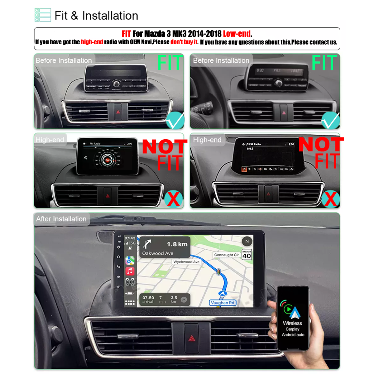 For Mazda 3 2014-2018 Carplay Car Stereo Radio Android 12.0 GPS NAVI WIFI 2+32GB For Mazda 3 2014-2018 Carplay Car Stereo Radio Android 12.0 GPS NAVI WIFI 2+32GB 9" For Mazda 3 2014-2018 ANDROID 12 CARPLAY CAR GPS STEREO NAVI RADIO WIFI 32GB Android 12 Car Stereo For Mazda 3 2014-2018 GPS Carplay Radio + Camera Features: ●HD 9" 2.5D Capacitive touch screen ● Wireless & Wired Carplay : wired or wireless Carplay in-vehicle system can closely integrate the user's iOS device and iOS experience with the dashboard system. Users who use wireless Carplay can connect to the car system via Bluetooth to realize voice-controlled navigation, make calls, send and receive messages, and listen to music. It is only available for iPhone(ZLINK APP) . ● Wireless & Wired Android auto : wired or wireless Android auto in-vehicle system can closely integrate the user's Android device and Android experience with the dashboard system. Users who use wireless Android auto can connect to the car system via Bluetooth to realize voice-controlled navigation, make calls, send and receive messages, and listen to music. It is only available for Android phone(Android phones need to download android auto APP) . ●Built-in GPS Navigation: Users can purchase directly from play store for offline navigation. With wifi connected, Google Maps can be used perfectly, you can go anywhere you want and never get lost again. ● High definition 1080P: Full capacitance touch screen for easy operation, well designed user interface for car only. ●Built-in WIFI: Connect to WIFI, and you will find a new world,the most convenient one is the online map. ●Rear camera: support AHD high-definition 1080P camera image input. ●Hi-Fi function: High fidelity, reproduced sound highly similar to your original sound ●Steering wheel control: Through it you can control the functions you need by steering wheel, more convenient ●Built-in Bluetooth with A2DP/Hands Free/Phone book:Bluetooth hands-free calls,Bluetooth music player,Auto loading phonebooks ● Double USB adapter input ●Support file manager: Support download, install and delete over thousands of android apps ●Support multilanguage: Support languages, up to 40 national languages ●You can enjoy music from you mobilephone without any cables, and also support USB connetion. ●FM Radio: Online music you can transfer the music to the car stereo by FM to enjoy the original car stereo sound,with 18 preset stations ●Time Setting:You can use the network or GPS to open the date and time automatically, or you can adjust it manually. ●Support external microphone Specifications: System:Android 12 Screen size: 9'' Memory: 2GB (RAM)+32GB (ROM) Screen Resolution:1280*800 CPU: 4 cores Bluetooth Version:4.0 Power output:4*45W Voltage:DC 12V Work temperature:-20℃-70℃ Apple CarPlay: Support Wireless/Wired Connection Android Auto: Support Wireless/Wired Connection Wifi:Support GPS:Support Steering wheel control function:Support camera: support Reversing input: AHD/CVBS Video output:Support Maps:Built-in offline maps(requires internet to download data) USB:Double USB interface Radio Band:FM Audio format:FLAC/WAV/MP3/WMA etc Video format:MKV/RMVB/AVI/MP4/MDV etc Picture format:PNG/JPEG/JPG/GIF/WBMP/BNP etc Bluetooth keyword:0000 Factory setting keyword:1617 or 3368 Language:English, Arabic, Russian, Hebrew, Spanish, Italian, French, Thai, German, Japanese, Korean, Turkish, Czech, Hungarian, Dutch, Polish, Swedish, Ukrainian, Romanian, Greek, Danish, Finnish Package Included : 1 x Car MP5 Player 1 x Power Cable 1 x GPS Antenna 1 x Camera 1 x Microphone 1 x OBD Adapter Cable 1 x Multimedia Control Button 1 x Rear Camera lnput Cable 1 x RCA Cable 2 x USB Cable 1 x Crowbar 1 x Instruction manual Notes: 1.We provide clear pictures, measurements where possible. Please check as much as possible to make sure the item is the one that you need. 2.Please allow 0.5-1 inch difference due to manual measurement.(1inch=2.54cm) 3.Vehicle Compatibility Chart May Vary Depending On Vehicle Options, Production Dates, And Install Application. Please Inquire Before Purchase. 4.Instruction is for Reference.Professional Installation Is Highly Recommended!!If you want to know how to use or install it,please contact us by Email.We will provide help as much as possible. Payment Delivery details Terms of sales About us Contact us Payment 1.We accept Payoneer 、 PayPal 、 Mastercard 、 VISA 、 Google Pay 、 American Express etc. 2.All major credit cards are accepted through secure payment processor. 3.Payment must be received within 7 business days of auction closing. 4.We ship to your eBay address. Please make sure your eBay address is correct before you pay. Delivery details Product will be shipped within 1-3 business days after full payment is received and verified. All domestic orders will be shipped via USPS, UPS or FedEx from our US warehouse and usually arrives to your door in about 3-5 business days. Delivery time depends on destination and other factors. We ship the package to your shipping address in eBay instead of the one in PayPal. Please tell us your shipping address if it is different from the one in eBay. The tracking number will be given for the customer to check the shipping status online (registered or faster service only). We are not responsible for any wrong or undeliverable addresses. Please verify and update your shipping address on eBay during checkout. Terms of sales We hope that you will be pleased with your order. However, in the event that your order is not suitable, we are happy to accept returns for a refund (excluding postage) or an exchange with 30 days of purchase. It is very important that you include a note with your eBay ID, name, reason for returning and return requirements. In the event of a return, the customer is responsible for postage costs. It is highly unlikely that a product may be faulty, however in the case returning postage will be refunded on arrival. Exchange and 