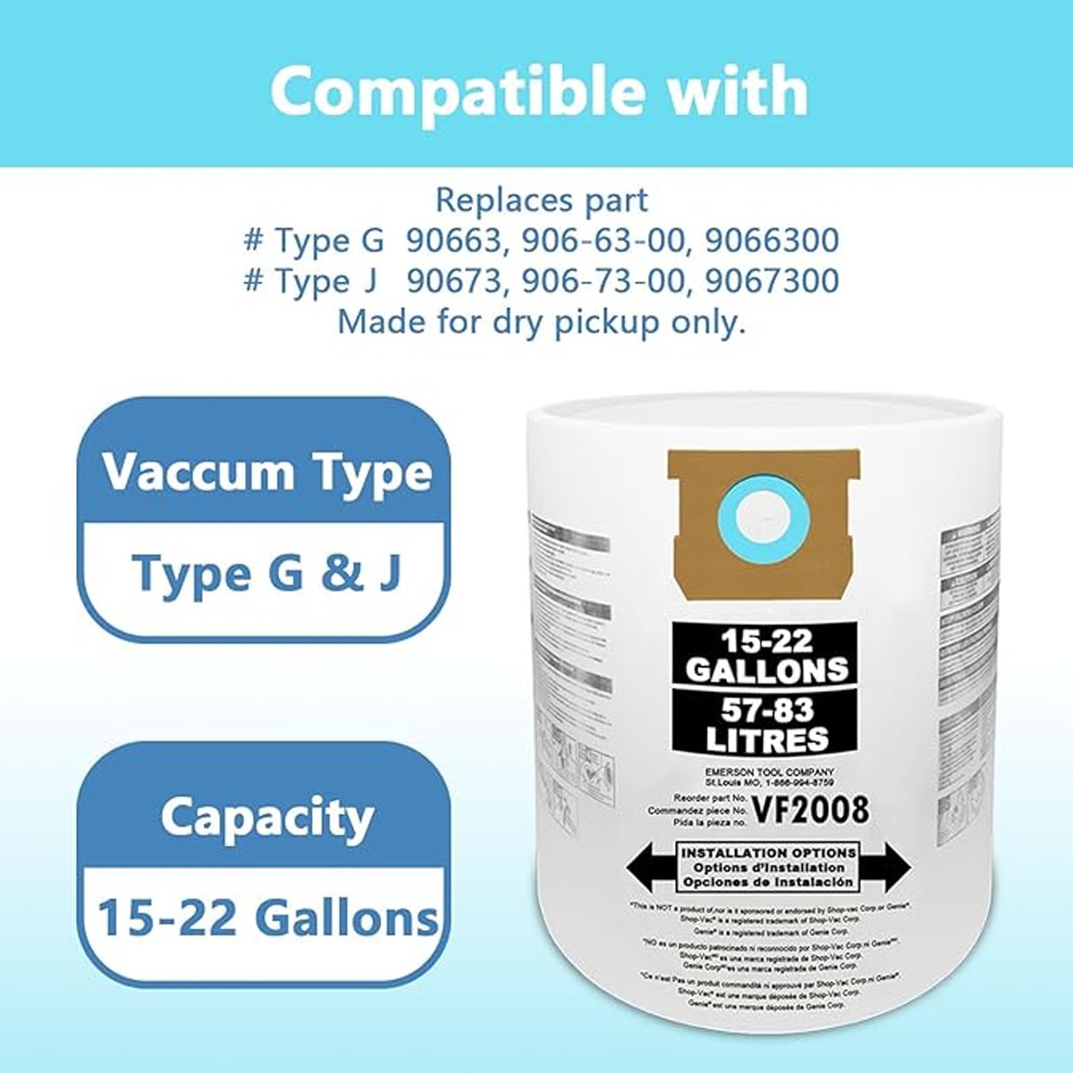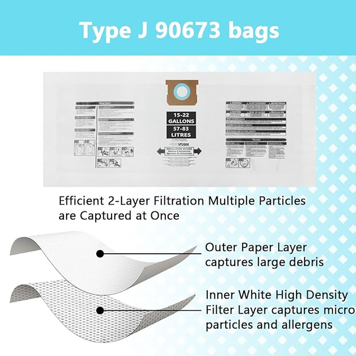 For Shop Vac Bags 15-22 Gallon Type G 90663 9066300 Type J 90673 9067300 VF2008