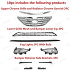Fit for : 1 Set (10 PCS) Includes:(See more pictures for details) 1 Pc front upper black grille with chrome trim 1 Pc front upper radiator grille garnish assembly 1 Pc front lower black grille mesh 1 Pc front bumper lower lip assembly 2 Pcs fog lights with bulb 2 Pcs front bumper side brackets 2 Pcs front bumper brackets Item OE number : 86355-3S100;86350-3S100;86561-3S000;86591-3S000;92201-3Q000;92201-3Q000;86555-3S000;86556-3S000;86513-3S000;86514-3S000 Installation : Perfect fit direct replacement, no modifications required. Installation manual not provided; we recommend professional installation. Item's-Features : Superior quality kit 100% brand new Made from high-quality materials Excellent replacement part, no modifications needed Other parts fit for