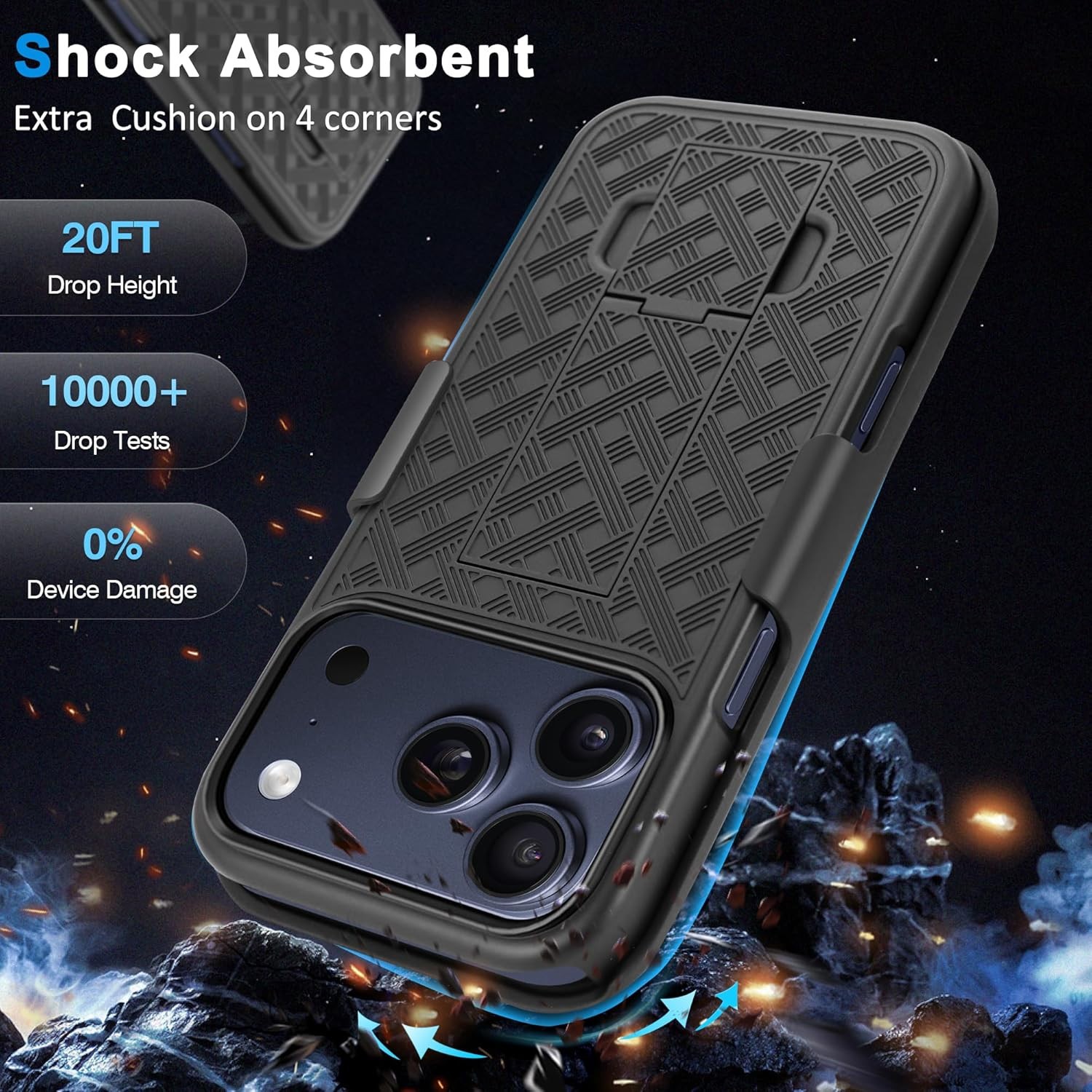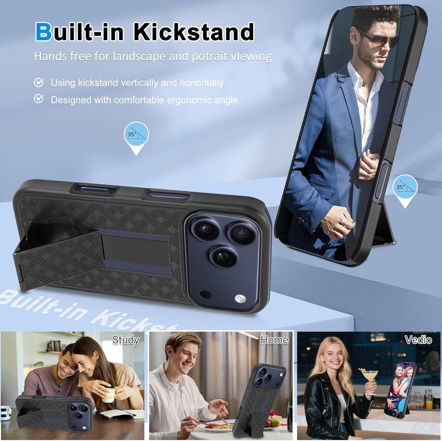 Select Correct Model From "Phone Model" Menu Apple iphone 17 6.3" inch Apple iphone 17 Pro 6.3" inch Apple iphone 17 Air 6.5" inch Apple iphone 17 Pro Max 6.9" inch Apple iphone 16 6.1" inch Apple iphone 16 Pro 6.5" inch Apple iphone 16 Pro Max 6.9" inch Apple iphone 15 6.1" inch Apple iphone 14 6.1" inch Go to about phone in your phone setting to double check if not sure phone model. --------------------------------------------------------------------------------------------------------------------------------------------------- Features: 1. Compatibility: This phone case special design for iphone 17 16 15 14 / 17 16 Pro / 17 Air / 16 17 Pro Max phone Released in 2025. Please double check your phone model before order. 2. Holster shell is engineered with practicality and durability in mind, combine with 2 interlocking hard plastic pieces to protect your phone against shocks, damages, dusts and scratches. 3. The Belt Clip iphone 17 16 15 14 Case / 17 16 Pro Case / 17 Air Case / 17 16 Pro Max Case is made with premium rubberized texture, which gives you added protection and makes gripping your phone very easy; and a soft felt lining further protects the screen from scratches or abrasions when the phone is encased in the holster 4. Built-in kickstand for hands-free viewing in both horizontal or vertical angles, giving you the freedom to view content on your phone any way you want, while the 180 degree rotating swivel clip provides easy adjustability and a sturdy locking mechanism to always keep your phone safe 5. Precise cutouts allowing access to camera, home button, headphone jack, microphone etc, Great side grips and clip holds tight to clothing. The low profile keeps carrying the phone from feeling bulky Package Includes: 1 x Heavy Duty Hybrid Dual Layer Shockproof Cell Phone Case Slim Combo Shell Cover with Kickstand 1 x Belt Clip Holster PRODUCT WARRANTY -30 Days Warranty After Product Arrived, If you received the product damage, please contact us with photo of the damage product for Free Replacement or Refund. SHIPPING Your order will ship out within 1 business day after purchased. (except for weekends or vacation) RETURN & EXCHANGE -If you received the product not fit your device, please put everything back into the original package, then contact us for exchange.