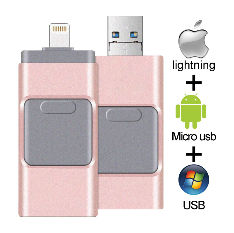 Product Description Product details 3-in-1 USB flash drive-This USB flash drive features a connector for iPhone and a standard USB A connector for computer, total 3 USB connectors available for use in different devices. Wide Compatibility-The pen drive is compatible with your iPhone, iPad, OTG Android phone or tablet, laptop, PC, Mac computer, freely transferring data among multiple systems and devices and making your work more efficient. Suppose to Windows 2000/XP/Vista/7/8/10, iOS, Mac OS v10.4/Linux v2.4/Android 4.0 or later Windows Privacy Protected-The first time you use it on your iPhone, you need to download and install the free Y- Disk app which features data encryption function to protect your privacy. Reliable & Durable-Grade- flash always keeps your data safe and push-pull design enables the end that is not in use hidden into the aluminum alloy cover to avoid damage. This jump drive is water-resistant and dustproof to withstand daily wear and tear, as well as shockproof to survive accidental drops. High Speed Transfer-Both Type-A connectors optimize USB 3.0 performance to speed up to 90Mb/s(read),30Mb/s(write) , allowing you to move and back up your full HD/4K movies, digital music, and high-resolution photos quick and fast. Specif ication Material: aluminum alloy + plastic Capacity: 256G,1TB,2TB Color: Rose Gold Weight:25g USB Type: Type-A, Lightining Package inc luded 1 x USB flash drive 1 x user manual