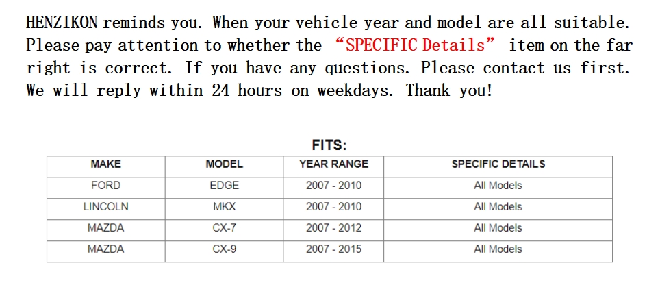 Product Description Rear Ceramic Brake Pads with Hardware for Ford Edge Lincoln MKX Mazda CX-7 CX-9 Rear Ceramic Brake Pads w/ Hardware Kit Includes: (1) Set Premium Ceramic Brake Pads w/Hardware - P-1259 Brake Pad Specifications: Premium Ceramic ALL CLIPS AND HARDWARE INCLUDED 4-Piece Rear Brake Pad Set FITS: MAKE MODEL YEAR RANGE SPECIFIC DETAILS FORD EDGE 2007 - 2010 All Models LINCOLN MKX 2007 - 2010 All Models MAZDA CX-7 2007 - 2012 All Models MAZDA CX-9 2007 - 2015 All Models Delivery Details ★ Please note that due to the complexity of the order, delivery times for some items may take longer than expected, leave a message to us for the most accurate ETA for your order. 99.9% of orders are shipped within 2 days. ★ It usually takes 2-5 working days to arrive. Deliveries may be delayed due to holidays and weather. Please allow up to 8 days delivery time. For remote areas, it may take longer. ★ Please provide accurate information for your order ①Full physical address ②Valid phone number ★ We shipped the goods according to the address on eBay,please check the address before placing an order. ★ We are not responsible for any wrong or undeliverable addresses. Please verify and update your shipping address on eBay during checkout. Tracking number will be sent to your Order Detail on eBay once the item has shipped. Return Policy ★60 Days Free Return and Money Back ★If you are not satisfied with your purchase, you can return the item with original packaging back to us for full refund, not any re-stock fee. ★If you receive any wrong items, or damage during the transportation or defect items, we will accept the return and pay the return freight. ★If you have made a mistake on purchase and wish to cancel the order before it is dispatched please ★contact us by ebay massages or email as quickly as possible. ★ The returned products must be placed in a complete box, and we do not allow partial package returns. ★The full refund or replacement will be available for all faulty items, including the original shipping cost. ★Please kindly contact us before return, our representatives will send you the detailed return instruction. ★The guarantee will be only for the cost of the item, we will not responsible for installation or other fees like labor expenses, towing expenses, additional repair expenses or other related expenses. Service Guaranteed ★ This item is backed by a 10 Year Warranty. In the event this item should fail due to manufacturing defects during intended use, we will replace the part free of charge (excludes shipping charges) for the original purchaser. ★ Our warranty covers the replacement of the part only and does not cover any associated costs in regards to labor or any other expenses incurred or associated with the purchase of the part. ★ This item is backed by a warranty against defects in materials and workmanship under its intended use. The warranty does not cover normal wear and tear. ★ The parts that we supply are intended for installation by qualified installers. Warranty will be void due to improper installation. Contact Us Business Hours: Monday to Friday:8:30 am to 5:30 pm (Beijing time) 7:30pm to 4:30am the next day (Eastern time) If you have any questions regarding out parts and services, please ask us a question. You may also send us an email through eBay at the top right corner of this page. About Us Welcome to our HENZIKON eBay store, where safety and performance meet! We specialize in offering premium brake discs (rotors) and brake pads tailored to enhance the stopping power and extend the lifespan of your beloved vehicle. 🚗Why Choose Us? Quality Assured: Every brake disc and pad we sell undergoes rigorous quality control to ensure they meet or exceed OEM standards.Affordable Prices: Get top-notch brake parts without breaking the bank. We offer competitive pricing to keep you and your wallet happy.Quick Shipping: Expedited shipping options available to get your brakes back on track in no time. 💪Safety First: we understand that brakes are the first line of defense when it comes to road safety. That's why we only offer products that prioritize your and your passengers' well-being. 💌Customer Satisfaction: Your satisfaction is our top priority. If you have any questions or concerns, our friendly customer service team is always ready to assist you. powered by