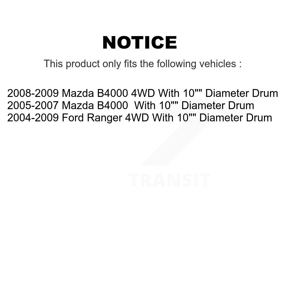 eBay Listing Template Search Required Parts View Our Feedback Contact Us Front Rear Brake Caliper Coat Rotor Drum Ceramic Pad Shoes Cylinder Kit For Ford Product Description Description: Notes: With 10" Diameter Drum Brand: Transit Auto Warranty: 1 Year Part Type: Disc Rotors and Brake Pads Kit Placement on Vehicle: Front and Rear CMX new calipers are manufactured to exacting OE standards to ensure a perfect performance for the life of the vehicle TQ OE-matched friction material gives our brake shoe the ideal balance between tensile and hardness and provide consistent wear, long life, and quiet operation TQ OE-matched material gives our spring kit the ideal balance between tensile and hardness and provide consistent wear, long life, and quiet operation Engineered with with Carbon-Enhanced G-Cast (G11H18/G3000) iron castings to achieve an optimal braking performance (strength, stability, durability) Item specifics: Includes (11 pcs): 2x Front Disc Brake Caliper (Both Side) 2x Front Coated Disc Brake Rotor (Both Side) 1x Front Ceramic Brake Pad Set (Hardware Included) 2x Rear Coated Brake Drum (Both Side) 1x Rear Drum Brake Shoe Set 2x Rear Drum Brake Wheel Cylinder (Both Side) 1x Rear Drum Brake Hardware Kit Interchange Part Numbers: 18A4759; SLB1732; 2C-4759; 18-P4759; 18-B4759; BC65050; SC1379; C65050; 2465XB; 99-17888B; 11-23115-1; FRC11204N; FRC11204C; FRC11204; CN3005; 18A4758; SLB1733; 2C-4758; 18-P4758; 18-B4758; BC65049; SC1380; C65049; 2465XA; 99-17888A; 11-23116-1; FRC11203N; FRC11203C; FRC11203; CN3006; AG54097; CR54097; PR54097; 54097; YH145341C; YH145341; 120.65082; 121.65082; BR54097; 54180; 248880027; 48880027; 748880027; 125721; EC54097; 680027; BD125721E; BD125721; 833A; 833B; D833A; D833B; 7793; 7794; 8864; 7706; SG7706X; SG7794X; AD7706; AD7794; FT7706; PF7706M; PF7706X; PF7794X; PF8864M; QE7706X; QE7794X; SS7706X; SS7794X; UP7706X; UP7794X; D833; 833; SCD833; AG8989; CD8989; PD8989; 8923; 8989; YH140697C; YH140810C; YH140697; YH140810; 122.65020; 122.65037; 123.65020; 123.65037; BD8923; 4401355; 4401657; 125134; EC8989; 2687; 9498; BD125134E; BD126367E; BD60543E; BD125134; BD126367; BD60543; 705; NB705; 705B; 34184; WC250000; W370061; WC370061; WC134318; 7295K; H7295; HW7295; H7210 Confirm Your Vehicle Compatibility Year Make Model Application Notes 2004 Ford Ranger 4WD; With 10" Diameter Drum; Position: Front and Rear; 2005 Ford Ranger 4WD; With 10" Diameter Drum; Position: Front and Rear; 2006 Ford Ranger 4WD; With 10" Diameter Drum; Position: Front and Rear; 2007 Ford Ranger 4WD; With 10" Diameter Drum; Position: Front and Rear; 2008 Ford Ranger 4WD; With 10" Diameter Drum; Position: Front and Rear; 2009 Ford Ranger 4WD; With 10" Diameter Drum; Position: Front and Rear; 2005 Mazda B4000 With 10" Diameter Drum; Position: Front and Rear; 2006 Mazda B4000 With 10" Diameter Drum; Position: Front and Rear; 2007 Mazda B4000 With 10" Diameter Drum; Position: Front and Rear; 2008 Mazda B4000 4WD; With 10" Diameter Drum; Position: Front and Rear; 2009 Mazda B4000 4WD; With 10" Diameter Drum; Position: Front and Rear; To confirm that this part fits your vehicle, enter your vehicle's Year, Make, Model, Trim and Engine in the eBay Compatibility Table. Also review the notes section in the compatibility chart for additional specifications about this part. Contact DT Auto Parts If you have any questions, you may reach us via our eBay Contact Form . Shipping & Handling Shipping Service: Please refer to shipping section Shipping Cost: Please refer to shipping section Order Processing Time: 1 Days Returns Return shipping paid by: Seller Item must be returned within: 30 Days Refund will be given as: MoneyBack About Us We are a small family business of auto parts and auto parts accessories. Our mission is to provide quality products, best customer care, and fast shipping. Whether you are doing maintenance, a long-term automotive project, or just trying to get your vehicle running, count on DTautoparts to help you with your small or big project. California Proposition 65 WARNING: This product may contain chemicals known to the State of California to cause cancer and birth defects or other reproductive harm. For more info go to www.p65warnings.ca.gov 2024 DT Auto Parts Inc. All Rights Reserved.