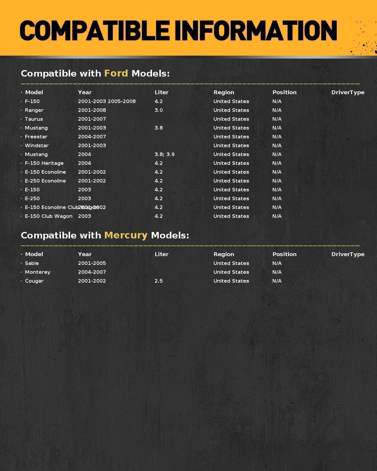 1 Pack Ignition Coil DG532 For Ford Mustang 2001-2004 Ranger Taurus 2001-2007 Item Description Brand new 100% Factory tested Superior quality parts Ready to use, Direct Replacement Replaces part number: 1F2U12029AC 1F2Z12029AC 5F2Z12029AD DG485 Built to strict quality control standards Package included: 1x ignition coil This part is compatible : FORD E-150 (2001 - 2003) FORD E-250 (2001 - 2003) FORD F-150 (2001 - 2008) FORD F-150 HERITAGE 2004 FORD MUSTANG (2001 - 2004) FORD RANGER (2001 - 2008) FORD TAURUS (2001 - 2005) MERCURY SABLE (2001 - 2005) Payment Shipping 1) we accepts all major credit cards via PayPal: MasterCard, Visa, American Express and Discover. 2) We will only ship to the confirmed PayPal shipping address given with the payment. Please make sure your PayPal and eBay address is correct. If not, please correct it before payment. Thank you. 3) If you want to ship to another address, please change your PayPal shipping address before you make payment. 4) To avoid initiating an unpaid item claim, please pay within 7 days. 5) Custom duties, taxes, or charges are not included in the cost you pay to us. We only ship this item to United States ! 1. We ship to your eBay address. Each package will be shipped by UPS or Fedex with tracking number. 2. Ship within 1 business day once payment completed. Orders placed on weekend will be shipped within 3 days. 4. Seriously promise: Refund or resend will be offered if item still not arrive in 7-10 business days. Just send us an email ,we will give you a satisfied solution as soon as possible. Return Policy Warranty If you send us an e-mail, it will be answered within 48 hours during our working hours. Please feel free to contact us if you have any questions: Dear my friend,we appreciate your support.And our goal is service you well and give you a pleasant shopping time in our store. ✅Dear customer, when you want to return or exchange goods (Please contact us first, instead of directly initiating a dispute) 1: Contact the seller first 2: Send pictures: outer packaging&scanned labels&item itself&with complete accessories, etc necessary condition Rule A: The original packaging of the item is in an unused state. Rule B: The outer packaging must not have any damage. 3: Obtain return label 4: Delivered Projects - Payment Repayment ✅A 15% restocking and shelving fee will be charged for returns or exchanges that are not caused by the seller and are in good condition. Exchange will not charge restocking fees or shipping fees due to transportation errors ✅Priority In case of the following reasons, the freight will be borne by the buyer 1: Unexpected order 2: Find a better price 3: Change your mind 4: Buy more items/make mistakes/misread model information ✅Please note Missing accessories/quality issues/transportation damage, etc Please contact us first to obtain a good solution, rather than directly opening a return dispute. Thank you very much for your understanding. I hope we have a pleasant cooperation! About Warranty ✅ Free repair: During the warranty period, if the product fails due to manufacturing defects, component failure or workmanship problems, please contact us to provide corresponding handling methods. ✅ Warranty period: The warranty period is usually calculated from the date of purchase, and the specific period may vary depend on the product type and brand. ✅ Extended warranty: Some manufacturers may provide additional extended warranty services, which usually require additional fees and may extend the original warranty period or provide a wider warranty coverage ✅ Warranty terms: The repairer needs to use components and spare parts that meet the technical requirements of the product, carefully record the failure and the quality of the product after repair, and ensure that the repaired product can be used normally for more than 30 days. ✅ Note: If there are any problems with the product received, please provide all relevant videos, pictures and other clues to facilitate our cunstomer service department and processing the issuse for you . Thank you for your support Contact Us Contact us if you have any question, Give us a chance to serve you, negative feedback could not solve anything, communication Please! ❎ (NO) Three stars is LOW star, NO 1,2,3 stars PLEASE! ✅(YES) Please give us Five-star! Have Question or Problem?? Step 1: Contact seller Step 2: Select the 1st topic: I have a question about using my item or I want to send the seller a message. NO others please! Step 3: Describe your question clearly; we will give you the best solution Please leave five stars positive feedback positive comment and Five-Stars. * We maintain a high standard of excellence (5 star rating) and strive for 100% customer satisfaction! * Feedback is very important to us. * We would like you to contact us immediately before giving us neutral or negative feedback so that we can address your concerns to our satisfaction. * If we don't understand these problems, we won't be able to solve them! * After understanding the problem, we will be able to give you a satisfactory answer! It's highly appreciated you leave us positive feedback and 5 star rating comments if you are satisfied with our service! Your comment is very important in our business success.
