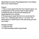 Voltage Rectifier Regulator Fit Suzuki DR200SE 199cc 96-13 32800-08D10 DR125SE A 21.87 USD Free shipping 8PCS Fuel Injectors Fit Mercruiser V8 350 MAG 5.0 4.3 6.2 885176 0280156081 YU 42.87 USD Free shipping 158x Motorbike Purple Fastener Clip Screw Kit Windscreen Fairing Bolt YU 19.87 USD Free shipping Auxiliary Relay 9010-150350 For CFMoto Hydraulic CF 500 800 X5 X6 X8 SWB LWB 12.87 USD Free shipping Stator 18 Pole For Honda TRX300 TRX300FW Fourtrax 300 2WD 4WD 1988-2000 76.83 USD 80.87 USD Free shipping 5% off Clutch Friction Plate Kit Set Fit For Sportster XL883 XL1200 Softail Dyna 22.79 USD 23.99 USD Free shipping 5% off Magneto Cover Gasket For Arctic Cat 400 FIS TBX TRV VP Auto 2X4 4X4 2003-2008 16.87 USD Free shipping Generator Cover Gasket For Kawasaki ER-6F ER-6N KLE 650 Versys Vulcan S ER650 12.87 USD Free shipping DRIVE BELT Fits KYMCO X-TOWN 300I EURO 4 XTOWN CITY 300i EURO 5 ELEGAN 250 V1 42.63 USD 44.87 USD Free shipping 5% off Car Windscreen Window Rear Wiper Arm Wiper Blade Set for VW Golf 5 MK5 2004-2008 18.87 USD Free shipping Carburetor Carb fit for Mitsubishi GM291 GM301 GB290 GB300 GT1000 8HP 10HP Carb 30.87 USD Free shipping Goldwing Chrome Fairing Premier Shark Gills Fit Honda GL1800 2001-2011 102.87 USD Free shipping A Fantastic Shop Send us a message Our Store Seller Profile Feedbacks Save this seller Contact Wiper Motor Connector Plug Replacement 12 pin Repair Kit for Ford Transit Custom Wiper Motor Connector Plug Replacement 12 pin Repair Kit for Ford Transit Custom Feature: 1.This is a loom repair kit for the Ford Transit Custom. It is a replacement for the common fault of water ingress corroding the pins on the plug and stopping the wipers/washers from working. 2.The best way to repair the loom is to cut and join the wires 1 by 1 matching each wire up 1 at a time. This should get your vehicle back on the road saving you time and money Package included: 1 x plug loom kits 12 x heat shrinkable solder ring terminals About US About Our Items We strive to describe all items accurately and thoroughly, with the utmost care and attention to detail. However, to ensure a mutually satisfactory transaction, we kindly ask for your assistance in thoroughly reviewing the item description and photos, and addressing any questions before placing a bid. Customer Satisfaction We stand behind our commitment with exceptional service, a 100% money-back guarantee, and a dedication to customer satisfaction. I am readily available to address any inquiries or concerns you may have, both before and after your purchase. Our aim is to ensure your shopping experience is enjoyable and that you're delighted with your purchase. Feedback Your feedback is crucial to our business's success. If you're satisfied with your purchase and the service you received, we would greatly appreciate your positive feedback, along with an overall Detailed Selling Rating (DSR) of 5. Please take a moment to leave us positive feedback. Our eBay account is set up to automatically reciprocate positive feedback once yours is received. If you're considering leaving neutral/negative feedback or opening an eBay/PayPal case, we encourage you to reach out to us immediately. We're committed to resolving any issues to the best of our ability. Shipping Parcel will be shipped using Standard shipping method. For security purposes, items will be shipped exclusively to the confirmed address on Paypal. Please ensure your Shipping address is up to date before proceeding with payment. Estimated delivery time within the United States ranges from 3 to 10 business days, depending on your location. Returns We accept returns within 60 days from the date the buyer receives the item. If the item is found to be defective upon receipt, the customer has up to 30 days from the date of receipt to request an exchange for a new item or a refund. For returns due to a change of mind, we accept items in their original selling condition. However, if the package has been opened due to a mistaken order, it does not qualify for our return policy. Please note that the buyer is responsible for covering the cost of return postage. If you encounter any issues, please reach out to us via eBay message, and we'll respond within 24 hours. Front Right Wiper Arm Bearing Kit Fit BMW 5 6 Series E60 E61 E63E64 61617185366. 32.87 USD Free shipping Wiper Washer-Windshield-Fluid Level Sensor 289111E400 for Nissan Altima Armada 17.87 USD Free shipping Black Rear Wiper Blade Cover Cap For VW MK5 Golf Polo Passat Caddy Tiguan YU 12.87 USD Free shipping Rear Wiper Arm Blade For 2008-2015 Dodge Caravan Chrysler Town & Country BLK YU 21.87 USD Free shipping 1PCS Right Front Bumper Headlight Washer Cap Cover Jet For Audi A4 B8 2008 SA 12.87 USD Free shipping Front&Rear Windscreen Washer Motor Pump for Land Rover LR3 RR Sport DMC500010 YU 16.87 USD Free shipping Left&Right Front Bumper Headlight Washer Cap Cover Jet For Audi A4 B8 2008 YU 17.87 USD Free shipping Windshield Wiper Motor Front for Audi Q7 4LB 4L1955119 4L1955603 4L1910113 YO 146.87 USD Free shipping Front Right Wiper Arm Bearing Kit Fit BMW 5 6 Series E60 E61 E63 E64 61617185366 32.87 USD Free shipping