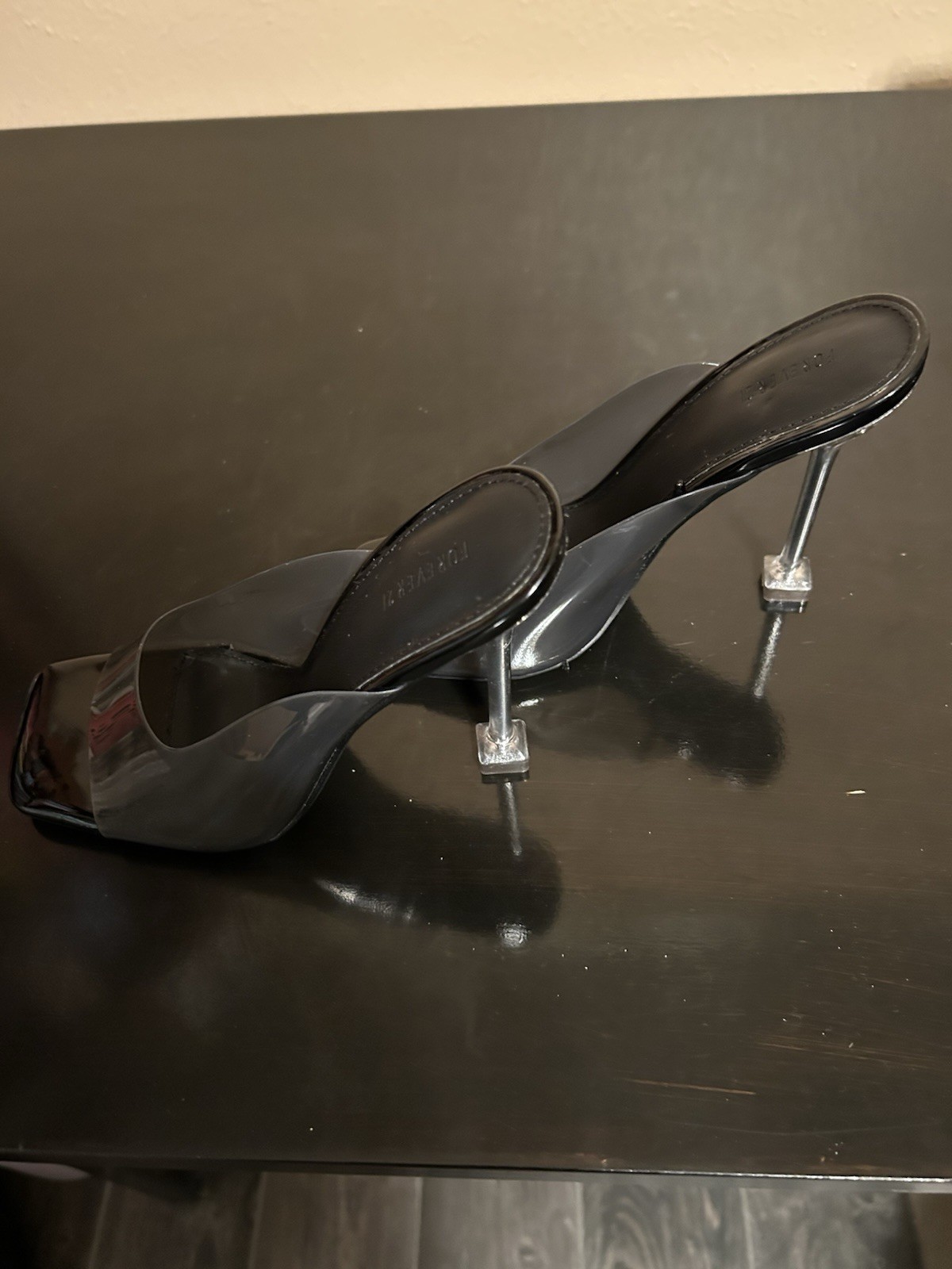 The Forever 21 Clear Heel Mules are a stylish and trendy choice for ladies in size 5.5. These clear mules feature black soles and clear straps, adding a touch of sophistication to any outfit. The synthetic upper material ensures durability and comfort, making them a versatile option for both casual and formal occasions. Stand out from the crowd with these fashionable heel mules from Forever 21. These show barely visible evidence of being tried on.