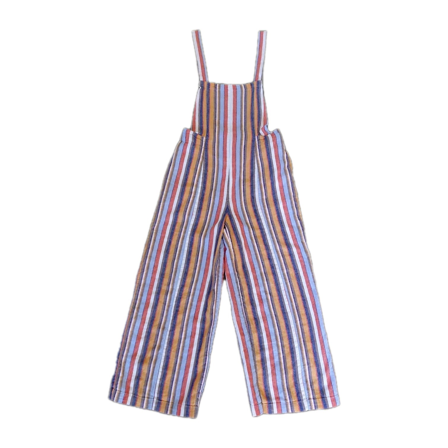 These Forever 21 Striped Overalls are the perfect blend of indie, boho, and whimsical styles, making them a standout piece for any woman's wardrobe. The wide-leg, cropped design with a square neckline and sleeveless feature adds a trendy and relaxed fit. The multicolor striped pattern and unique accented pockets give these overalls a playful and artistic touch, ideal for casual occasions or creative-inspired looks. Made from a comfortable linen and cotton blend, these overalls are a versatile and stylish choice for any season.