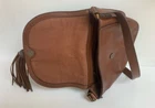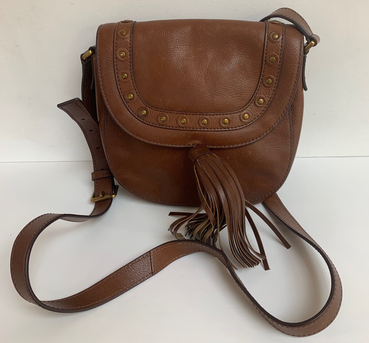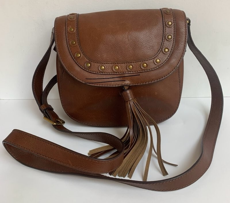 This Fossil EMI saddlebag is a stylish addition to any outfit. The bag is made of high-quality leather in a classic brown color. It features studded brass accents, and a magnetic snap closure. The meassuers 9 inches in width, 9 inches in height, and 3 inches in depth. The bag is designed with a crossbody strap that can be adjusted to fit your preference. It also has a tassel accent that adds a touch of flair to the bag. The interior is lined with brown leather and has enough space for your essentials. This Fossil EMI saddlebag is perfect for a casual occasion and is a must-have for any bag lover.