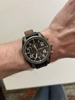 The Fossil Men's Watch is a stylish timepiece featuring a vintage bronze chronograph design with Arabic numeral indices. This watch is made of stainless steel with an authentic leather strap, giving it a unique and sophisticated look. The watch is a casual style with a round case shape, fixed bezel, and two-piece strap closure. It is powered by a quartz movement and can be worn by men who appreciate both fashion and functionality in their accessories. **Good condition, moderate marking and scuffs to the face
