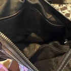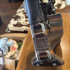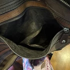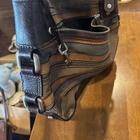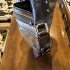 This Fossil shoulder bag is a vintage-inspired piece with a bohemian flair, featuring a multicolor striped design on genuine leather and suede materials. The bag has a distinctive 90s style with grommet, buckle, and studded accents, as well as a distressed finish for added character. The medium-sized rectangle bag has a zip closure, inner pockets, and a brown polyester lining, perfect for travel, parties, casual outings, or business settings. The brown leather shoulder strap adds a classic touch to this colorful and unique accessory.