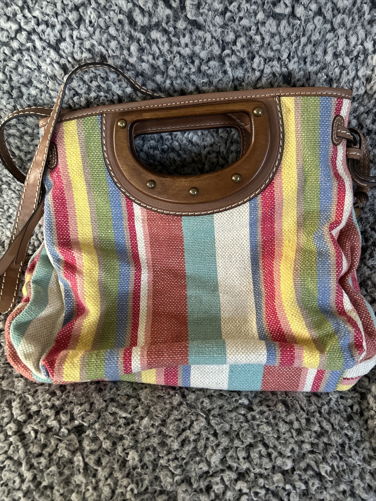Fossil Wooden Handles Multicolor Striped Canvas Leather Satchel Shoulder Bag EUC. Condition is Pre-owned. Shipped with USPS Priority Mail.