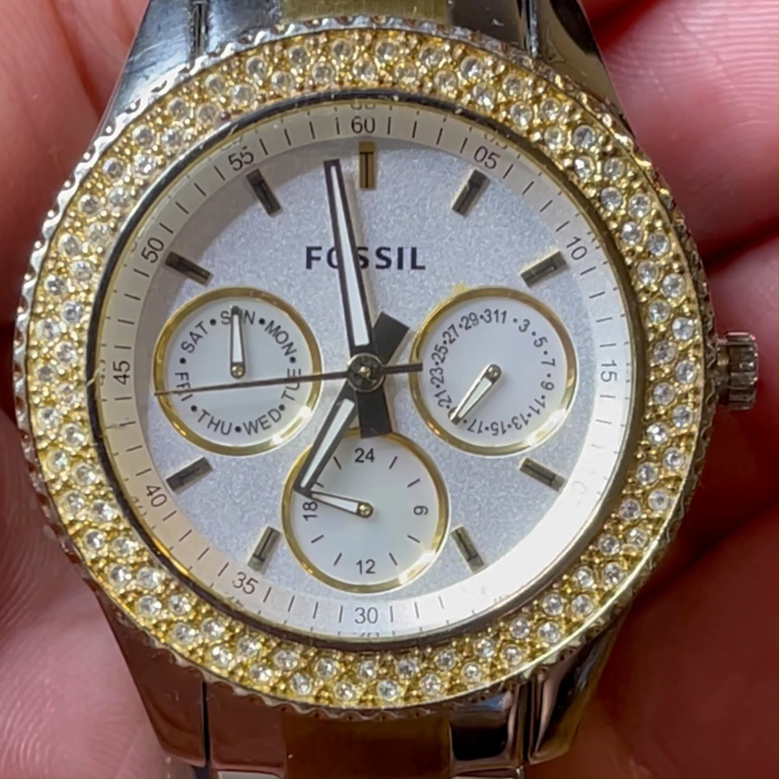 Fossil Stella Watch Womens Two Tone Rhinestone Bezel Mother of Pearl Dials WORKS Elevate your style with this Fossil Stella Watch. Featuring a stunning two-tone design, rhinestone-encrusted bezel, and mother of pearl sub dials, this timepiece is the epitome of sophistication. Its reliable functionality makes it perfect for everyday wear, while its elegant design makes it a standout accessory for special occasions. The watch is in good used condition and ready to wear. There is some scratching on the case and bracelet. Some of the gold tone is also faded on part of the bracelet. The watch is in good working condition.