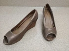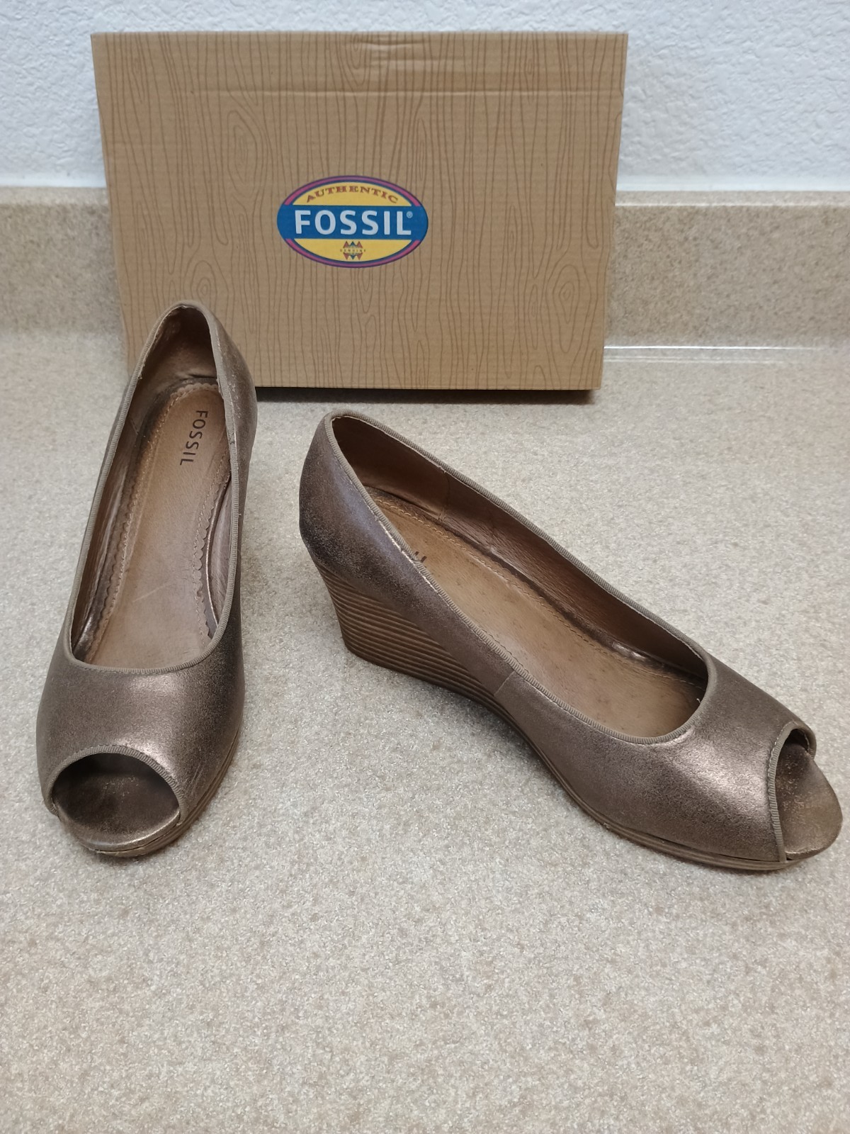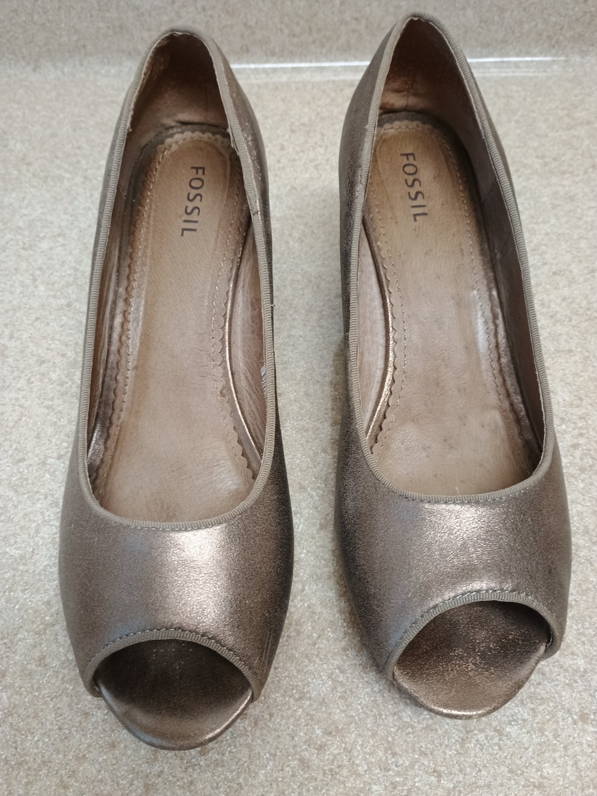 The Fossil Women’s Metallic Bronze Leather Pumps are stylish and versatile heels perfect for various occasions such as weddings, parties, formal events, and business meetings. With a sleek peep toe design and mid-height wedge heel, these shoes are both fashionable and comfortable. Made from high-quality leather with a metallic bronze color that adds a touch of glam, these pumps are sure to make a statement whether you're dressing up for a special occasion or adding a pop of color to your outfit. Ideal for all seasons, these Fossil heels are a must-have for any woman's wardrobe.