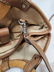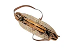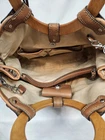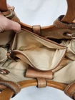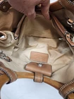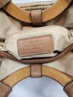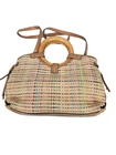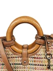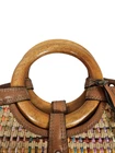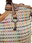Fossil Woven Straw Purse Round Wooden Handle Rainbow Women's Handbag. In great condition Fossil Woven Straw Purse Round Wooden Handle Rainbow Women's Handbag. Features Fossil multicolored woven straw bag, Round wooden circle handles, Side drawstrings, Snap closure, detachable tab leather strap to make a shoulder purse or crossbody purse, Wood is a beautiful light teak color, Subtle rainbow woven striped pattern, silver Fossil key charm, Leather bottom, large interior compartment with divider, 1 center zippered compartment and 2 compartments on each side, multifunctional pockets, and interior change zipper pocket. Measurements length 13" height 13" to top of wooden handles depth 4.25" strap drop 22.5" Fabric woven straw This is a pre-owned item that may show signs of wear. In great condition, there is a spot on the bottom and a couple spots on the interior.
