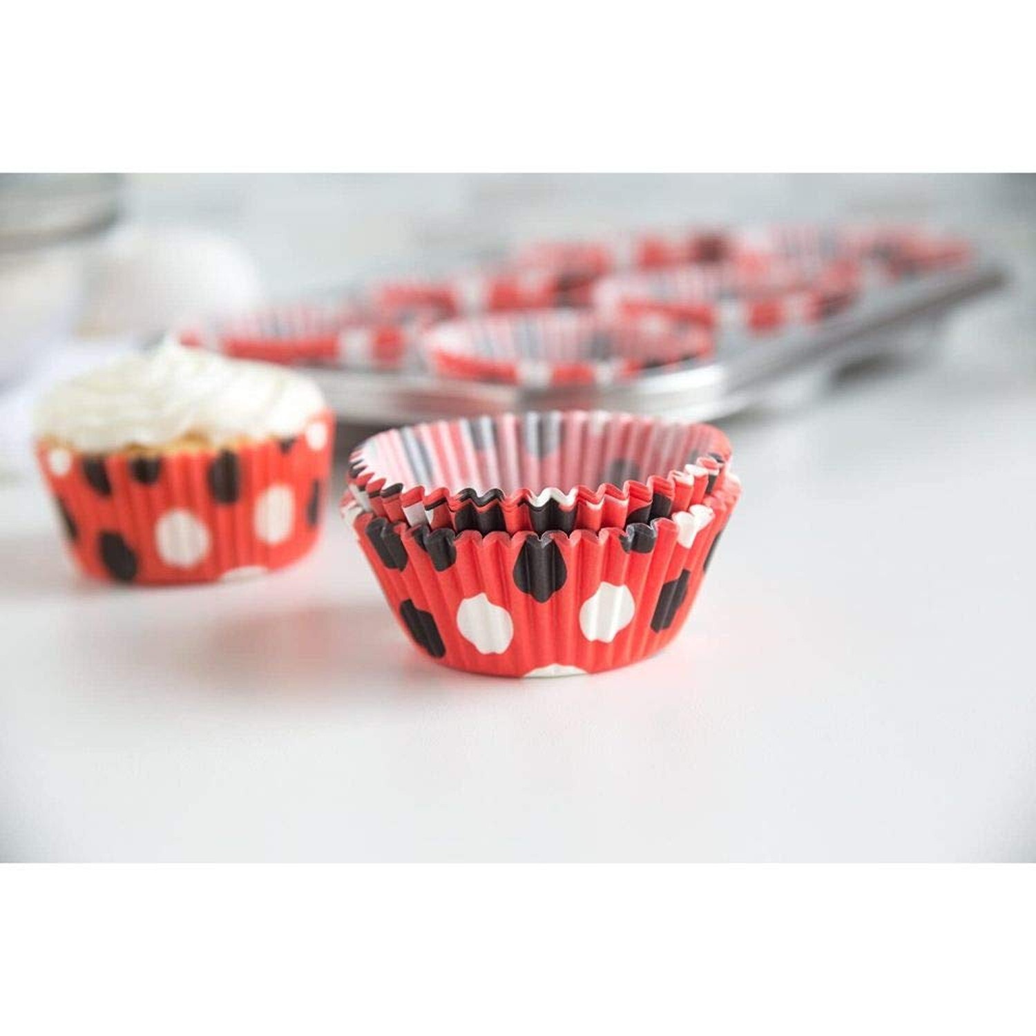 Fox Run Polka Dot Foil Muffin and Cupcake Liners, Set of 50, Standard Size Wrappers Product Details Color: Red with Black Brand: Fox Run MPN: 6900 UPC: 030734069004 EAN: 7107015984738 Color: Red with Black Brand: Fox Run Material: Paper Item dimensions L x W x H: 3 x 3 x 1.25 inches Capacity: 4.54 g Color: Red with Black Brand: Fox Run Material: Paper Item dimensions L x W x H: 3 x 3 x 1.25 inches Capacity: 4.54 g Reusability: Disposable Occasion: Birthday Material Feature: Disposable Shape: Round Size: 3 x 3 x 1.25 inches UPC: 030734069004 Global Trade Identification Number: 04 Manufacturer: Fox Run Craftsmen Number of Items: 50 Product Dimensions: 3 x 3 x 1.25 inches Item Weight: 0.16 ounces Country of Origin: China Item model number: 6900 Date First Available: April 26, 2012 PUT THE FUN IN FUNCTION: These baking cups come with fun red, black, and white polka dot design, perfect for birthday parties or themed events! FOOD SAFE: These cups are great for muffins, cupcakes, and more! They also come with a classic fluted design. THE MORE THE MERRIER: This cupcake set comes with a pack of 50 multi-color liners, ideal for bake sales, gatherings, and more. EASY TO USE: Simply pour in batter, bake, and enjoy! MEASUREMENTS: These baking cups weigh 0.16 ounces and have dimensions of 3 x 3 x 1.25 inches. Make your cupcakes stand out and be the highlight of the party! These red and black polka dot bake cups are sure to take your cupcakes up a notch. This set includes 50 standard size food-safe, fluted greaseproof paper baking cups, so you can bake and serve tons of cupcakes for your guests. Simply place in a muffin tin and fill with your favorite batter to dress up your cupcakes. Perfect for any occasion!